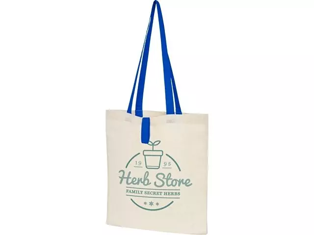 Эко-сумка с открытым основным отделением и цветными ручками, раскладывающаяся в высоту на 32 см. Имеет ремень с пуговичной застежкой, чтобы закрывать сумку. Прочность до 8 кг.