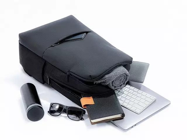 Многофункциональный рюкзак для командировок. Вмещает ноутбук до 15.6", аксессуары, а также имеет объемное отделение для других личных вещей. Суммарный объем 18 литров, надежные молнии YKK и усиленная строчка. Есть прочная ручка для переноски в одной руке. Скрытый карман у спинки для смартфона. Изготовлен из тканей 900D и 600D с гидрофобным покрытием внешней поверхности рюкзака (защита от брызг). Петля для крепления на чемодане-тележке.