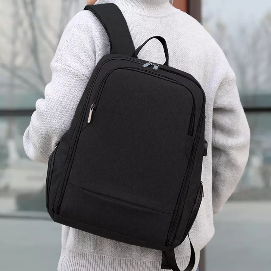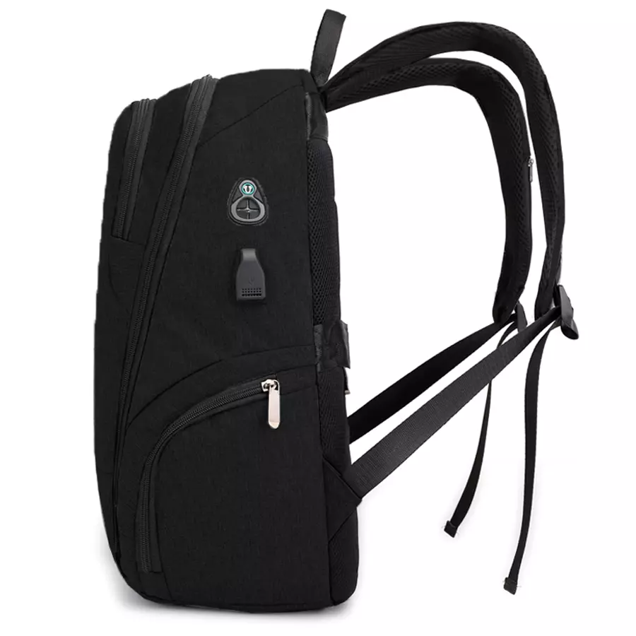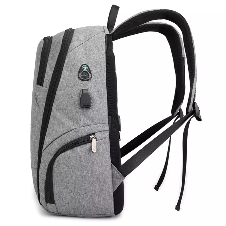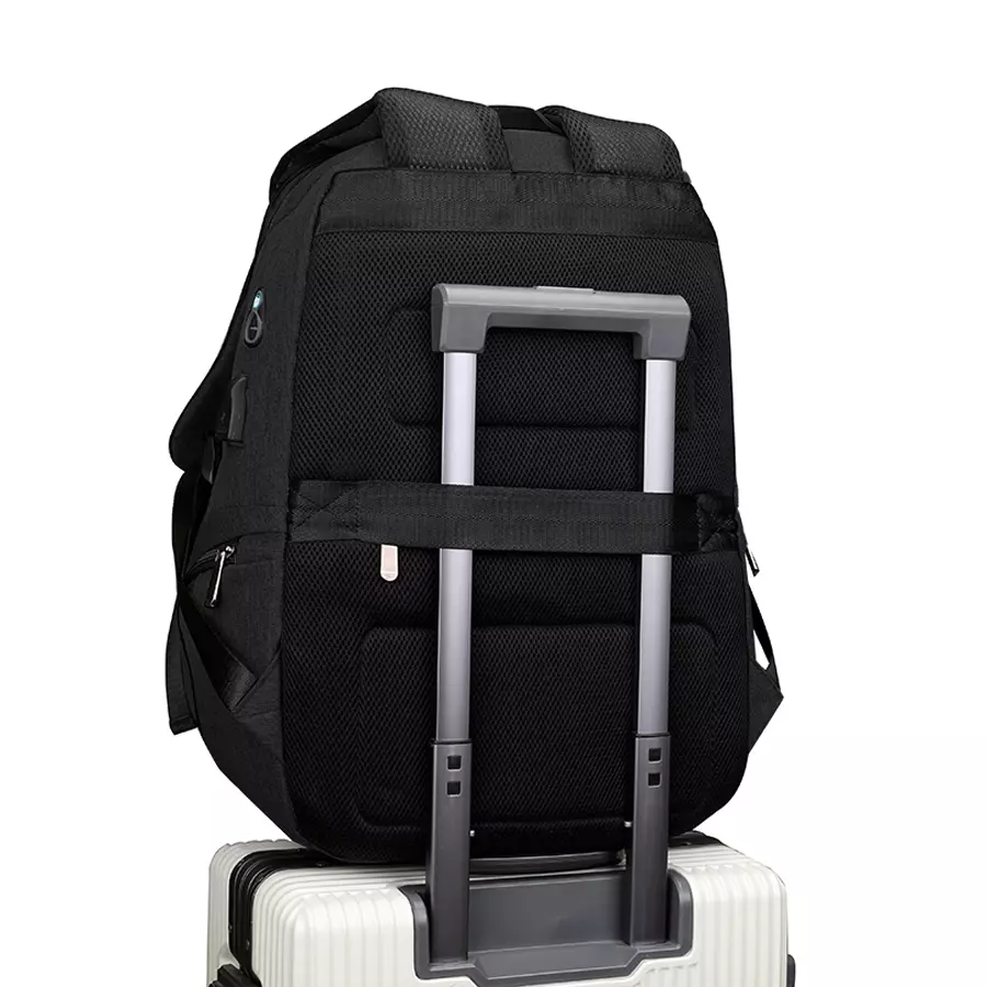 Сочетание прочных материалов и функциональности. Одно переднее отделение для мелочей. 2 боковых отделения на молнии, вместительное основное отделение имеет карман для ноутбука, 2 кармана для мелочей и 2 кармана для письменных принадлежностей. Снаружи есть USB-разъем с проводом внутри для подкдючения внешнего аккумулятора, а также отверстие для наушников. Ручка, спинка и лямки рюкзака с системой вентиляции, со стороны спины есть лямка для размещения рюкзака на ручке чемодана. На левой лямке есть карман на замке для пропуска/проездного. На спинке рюкзака расположен большой скрытый карман