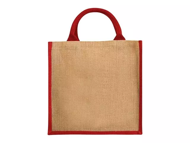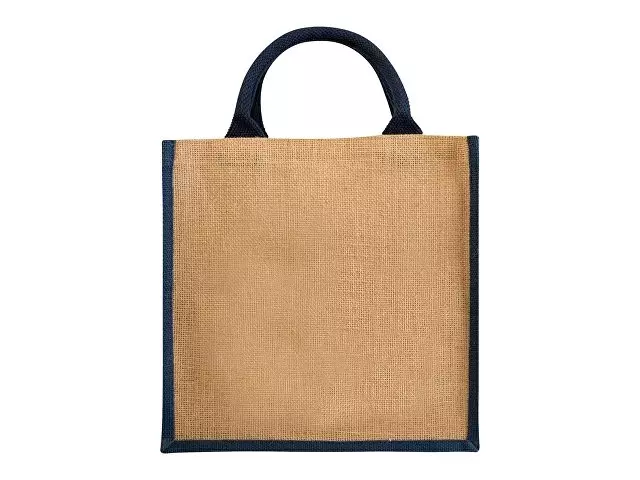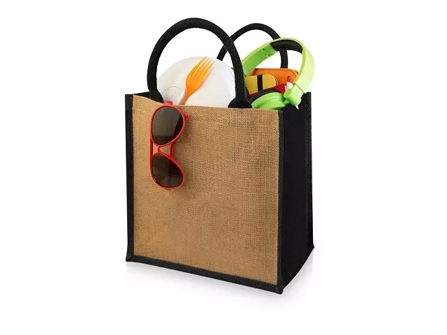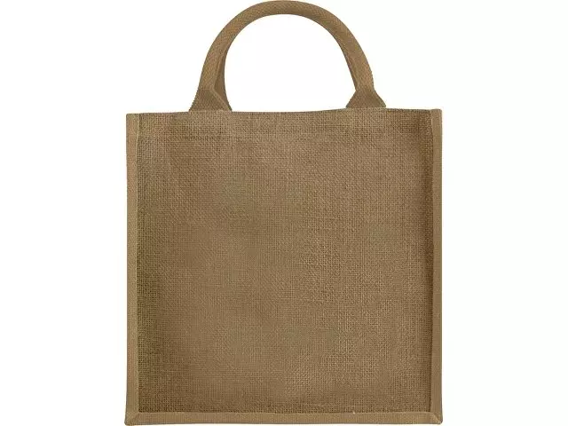 Джутовая подарочная сумка Chennai. Джутовая сумка с ламинированным открытым основным отделением и вставкой. Хлопковые ручки высотой 11,5 см. Джут.