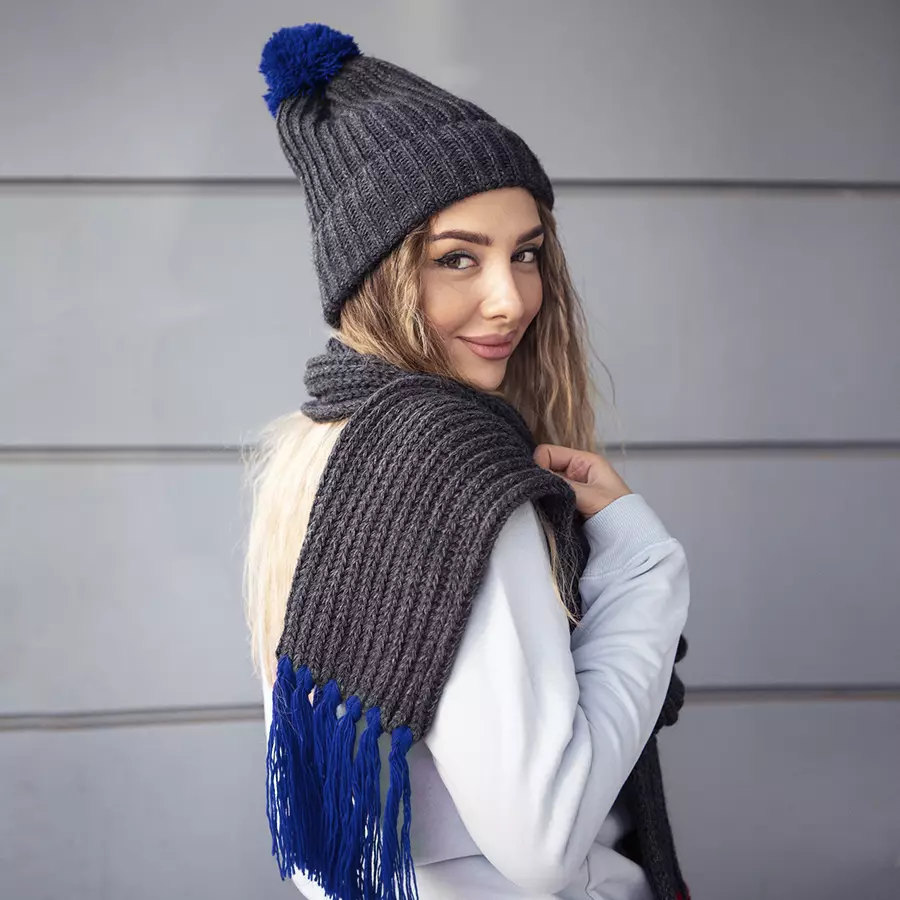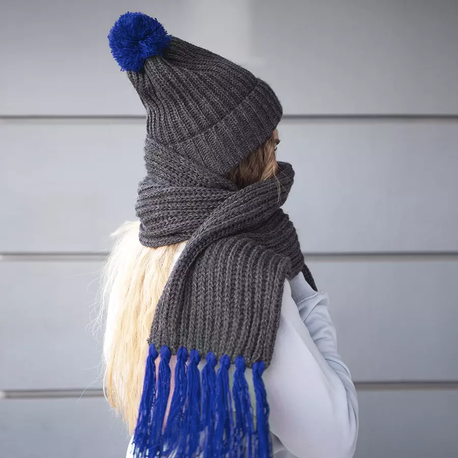 GoSnow, вязаный комплект шарф и шапка, антрацит c фурнитурой бирюзовый