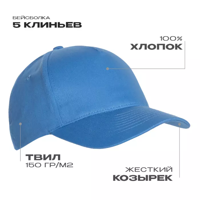 Для изготовления бейсболки использовали плотный хлопковый твил, благодаря которому изделие защитит от непогоды и надолго сохранит форму.