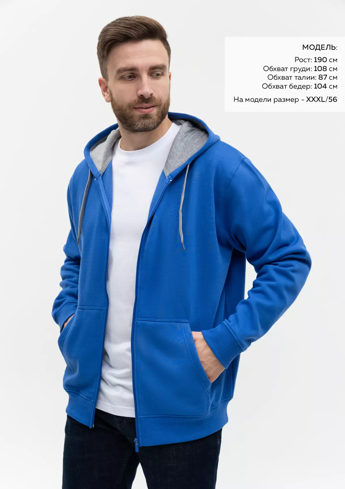 Размер мужской толстовки: XXL/54. Параметры модели: рост 190 см.; обхват груди 108 см.; обхват талии 87 см.; обхват бедер 104 см.