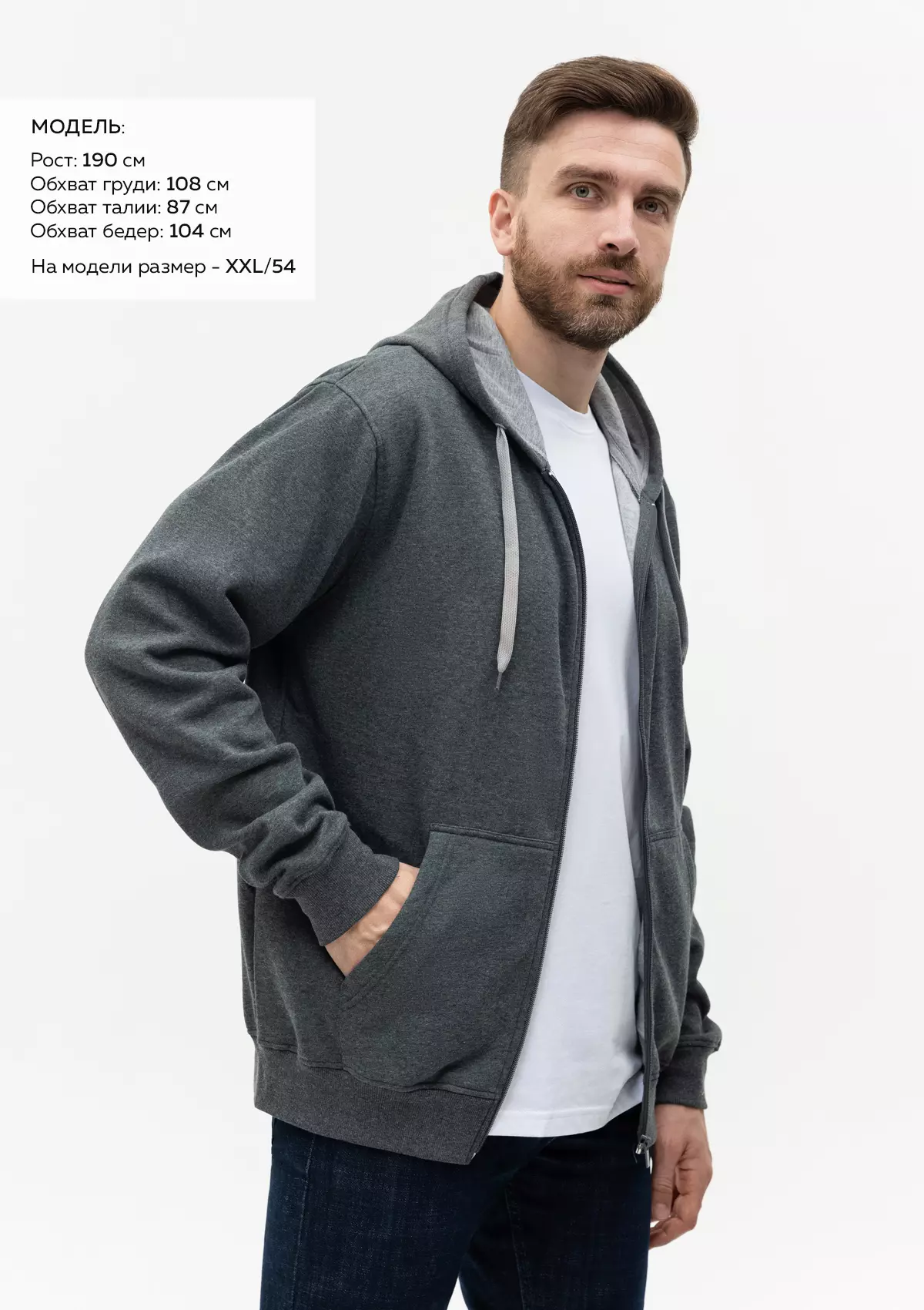 Размер мужской толстовки: XXL/54. Параметры модели: рост 190 см.; обхват груди 108 см.; обхват талии 87 см.; обхват бедер 104 см.