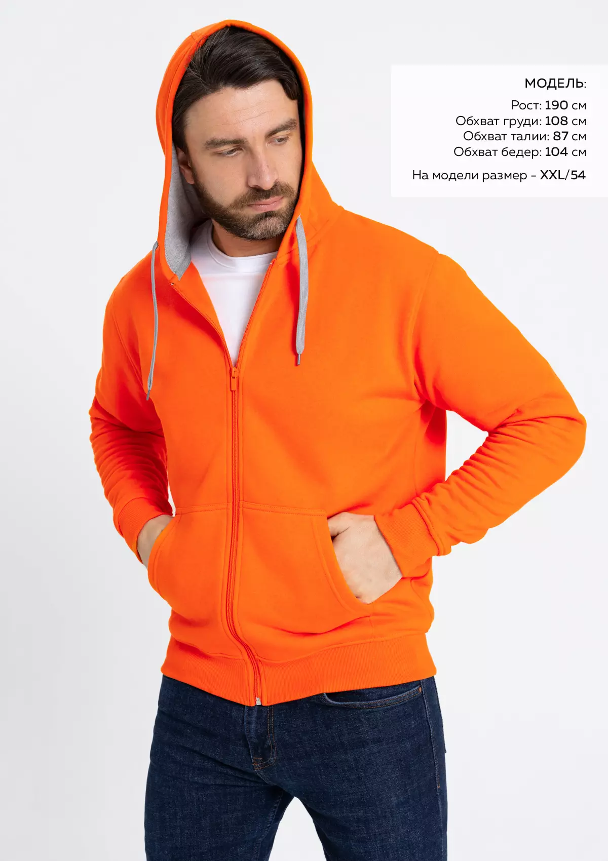 Размер мужской толстовки: XXL/54. Параметры модели: рост 190 см.; обхват груди 108 см.; обхват талии 87 см.; обхват бедер 104 см.