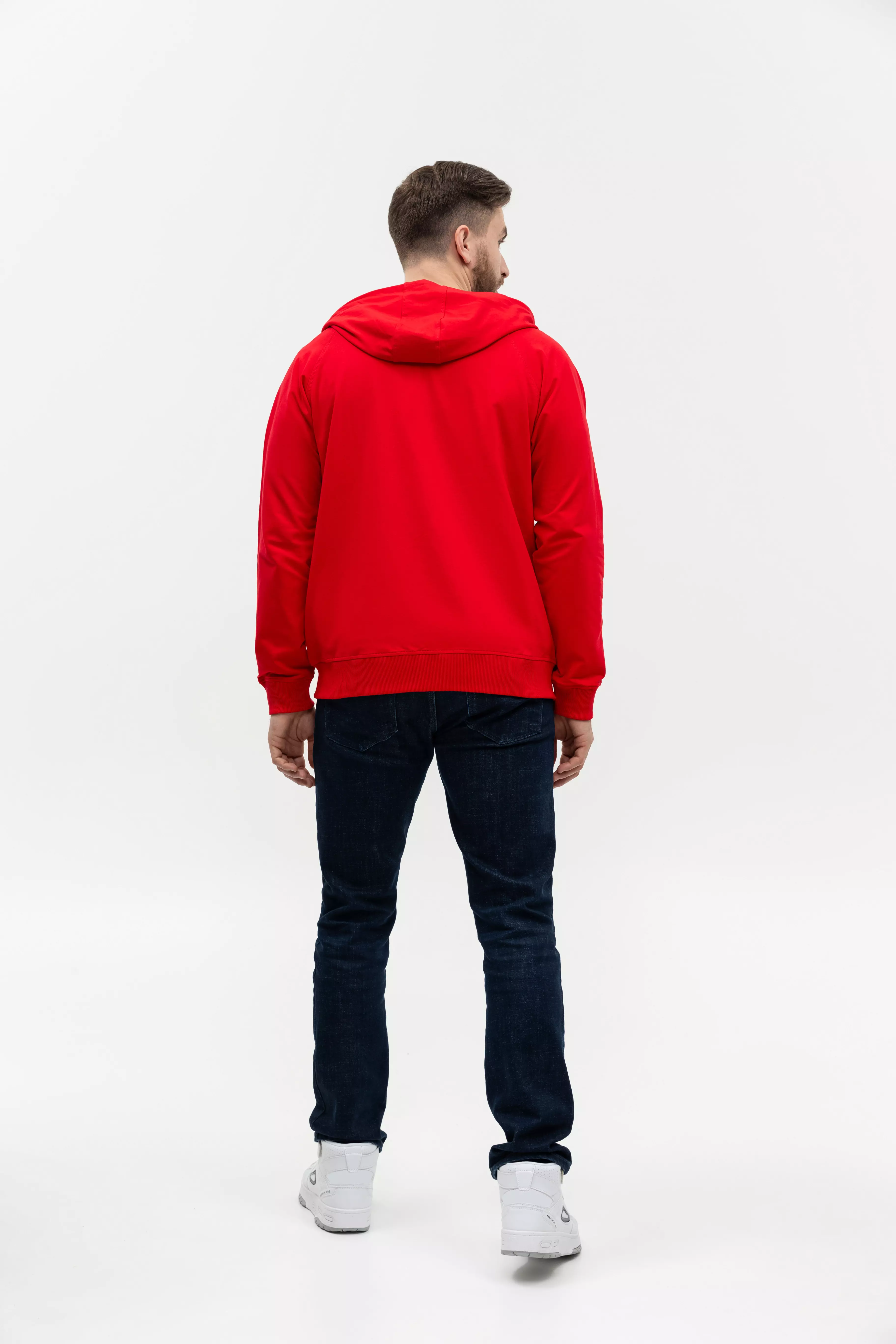Мужская толстовка прямого силуэта с капюшоном комфортной глубины, рукавом-реглан, глубоким накладным карманом и застежкой на молнию контрастного цвета. Капюшон дополнен шнурком для регулирования прилегания, манжет и низ изделия оформлены широкой эластичной резинкой.