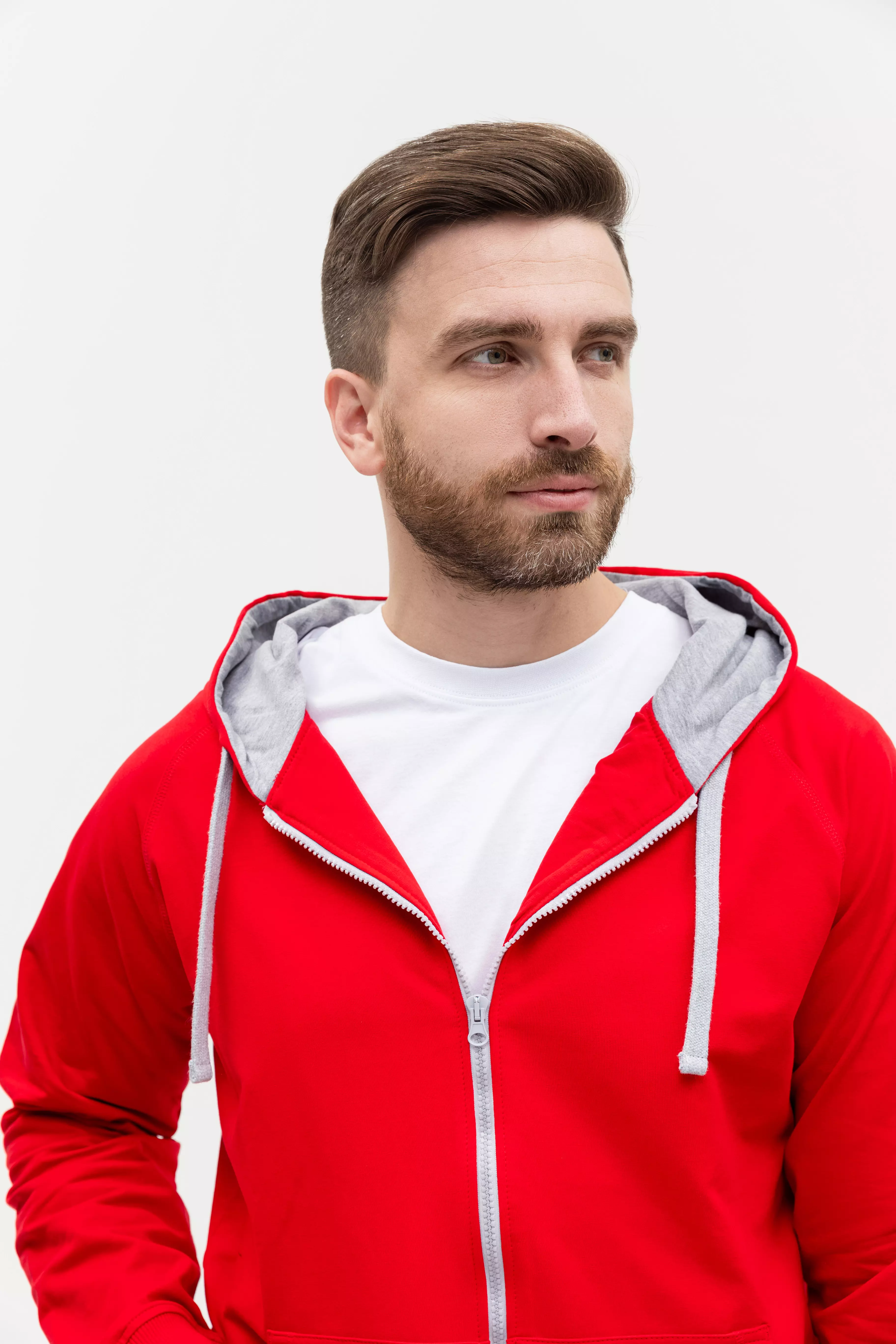 Мужская толстовка прямого силуэта с капюшоном комфортной глубины, рукавом-реглан, глубоким накладным карманом и застежкой на молнию контрастного цвета. Капюшон дополнен шнурком для регулирования прилегания, манжет и низ изделия оформлены широкой эластичной резинкой.
