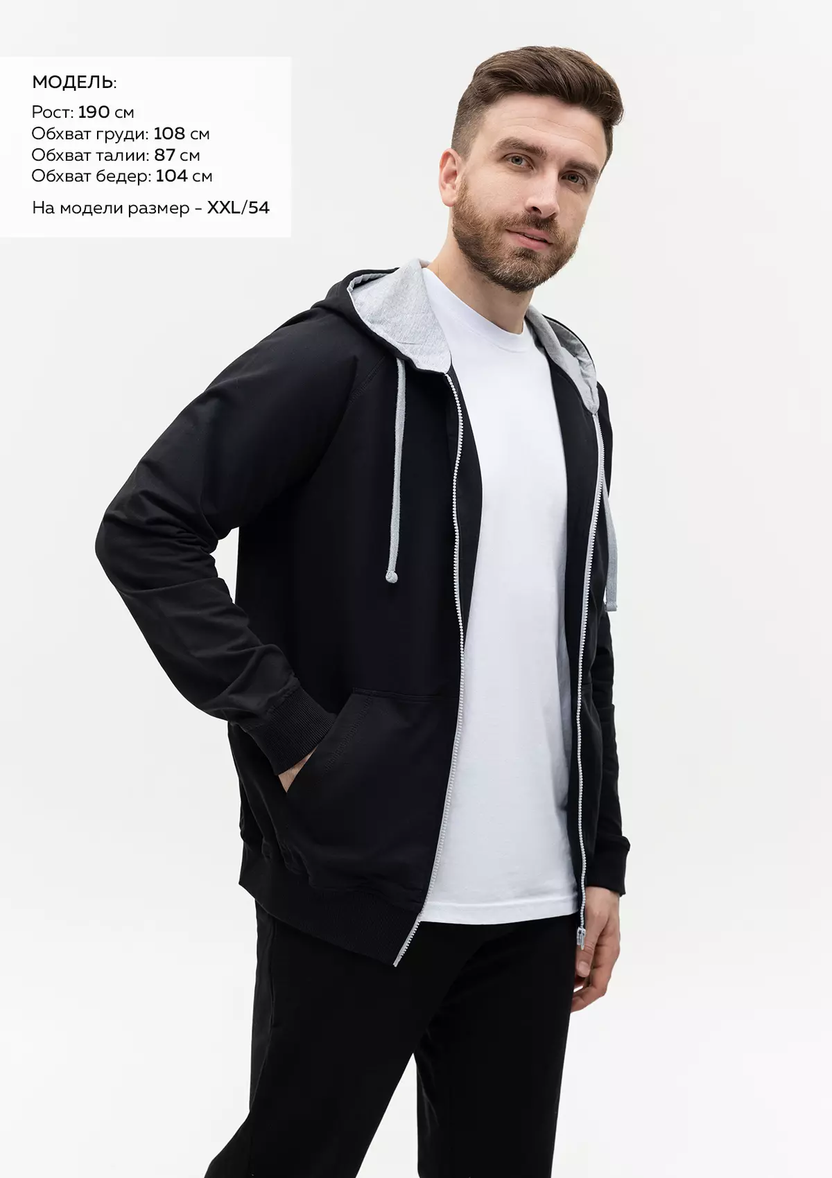 Размер мужской толстовки: XXL/54. Параметры модели: рост 190 см.; обхват груди 108 см.; обхват талии 87 см.; обхват бедер 104 см