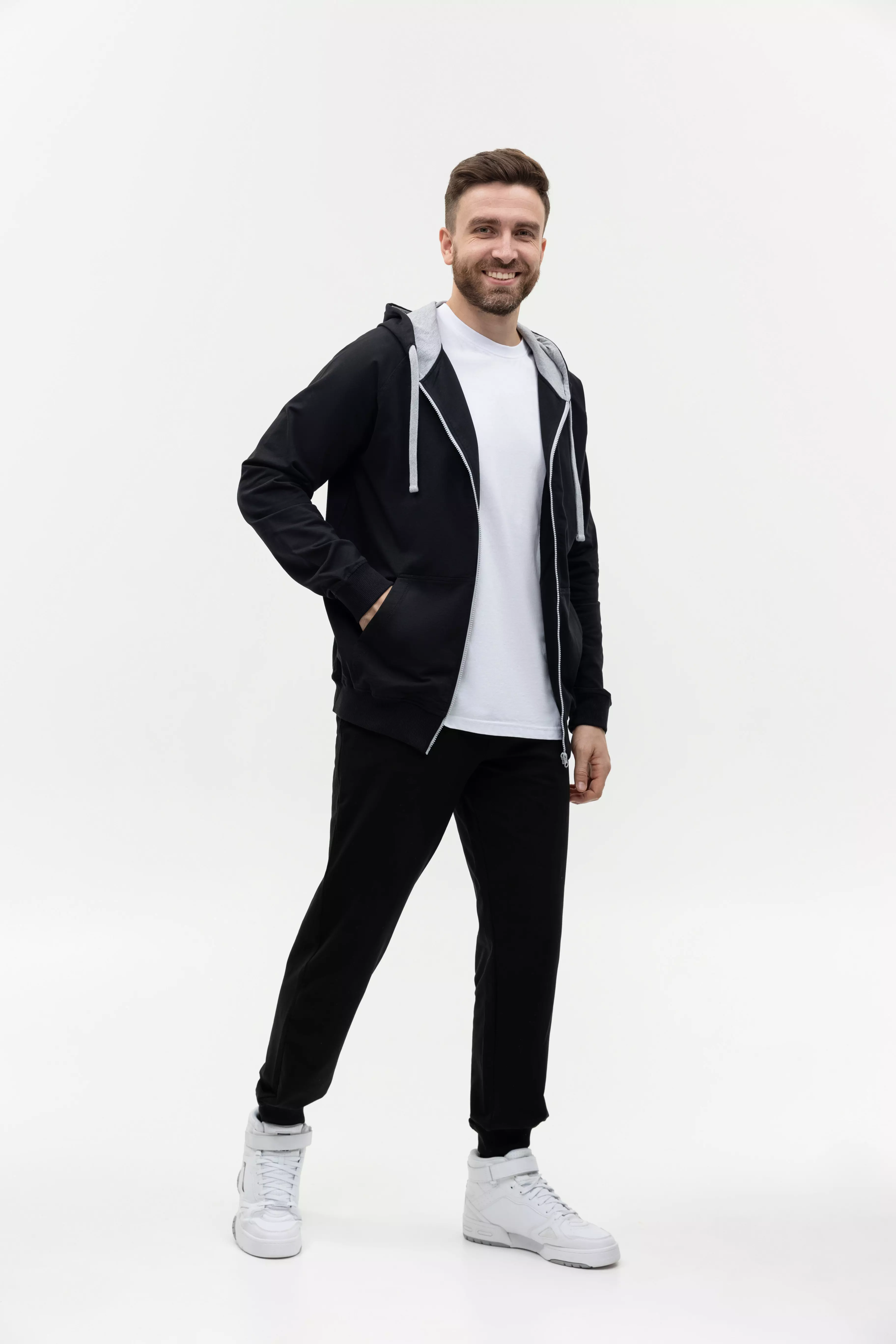 Мужская толстовка прямого силуэта с капюшоном комфортной глубины, рукавом-реглан, глубоким накладным карманом и застежкой на молнию контрастного цвета. Капюшон дополнен шнурком для регулирования прилегания, манжет и низ изделия оформлены широкой эластичной резинкой.
