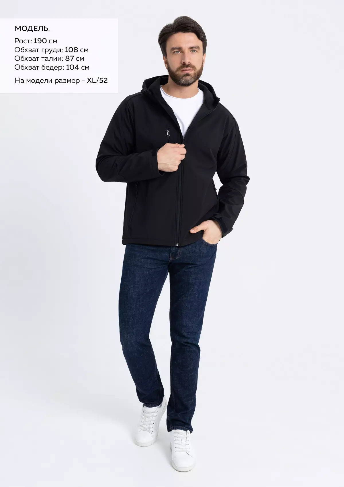 Размер на модели: XL/52. Параметры модели: рост 190 см.; обхват груди 108 см.; обхват талии 87 см.; обхват бедер 104 см.