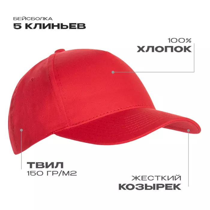 Для изготовления бейсболки использовали плотный хлопковый твил, благодаря которому изделие защитит от непогоды и надолго сохранит форму.