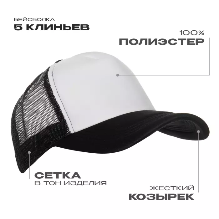 Бейсболка с сеткой без лобового шва с жёстким изогнутым козырьком, плотность прилегания регулирует надежная пластиковая застежка. Передний клин и козырек усилены поролоном, благодаря чему модель имеет узнаваемый характерный силуэт.
