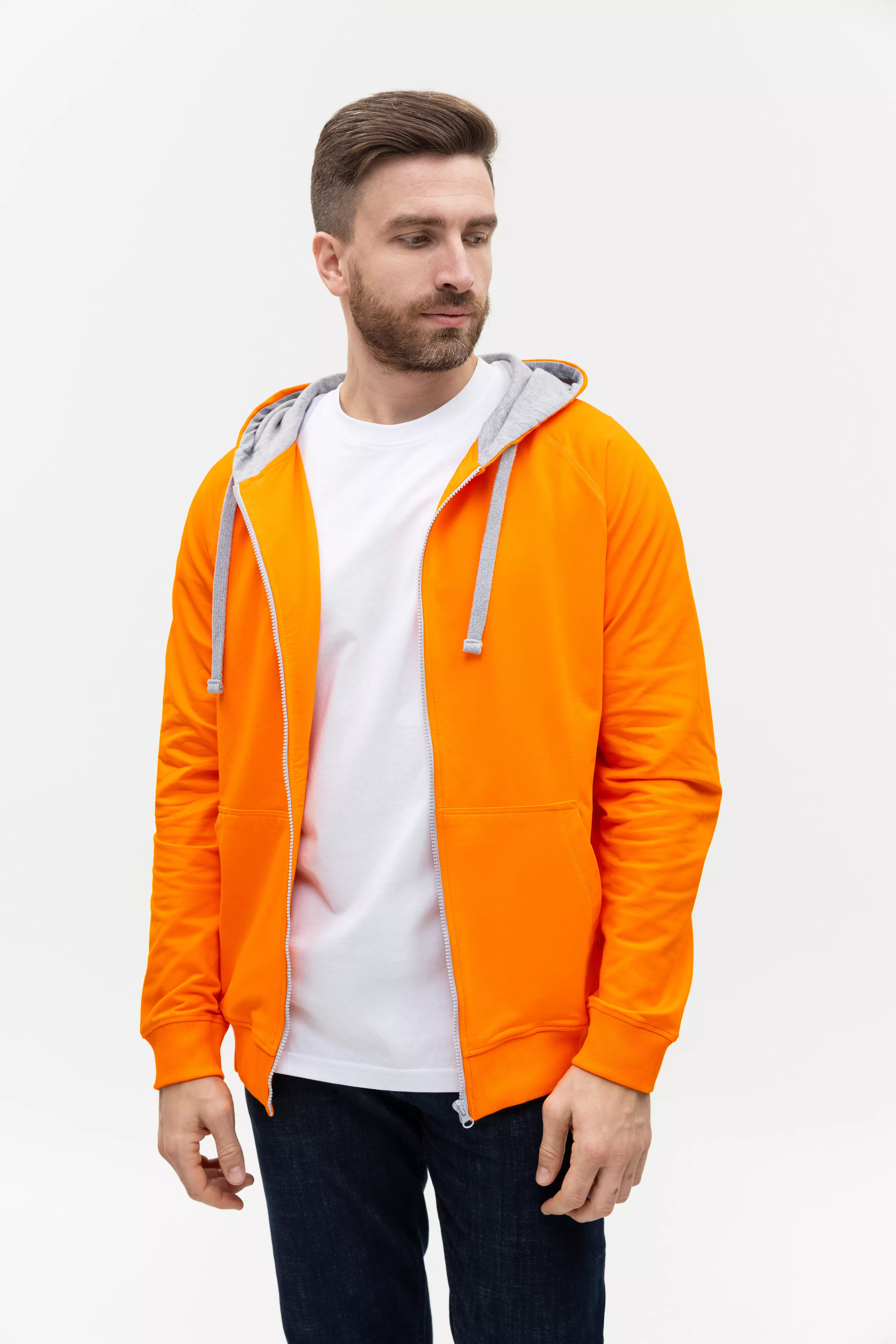 Мужская толстовка прямого силуэта с капюшоном комфортной глубины, рукавом-реглан, глубоким накладным карманом и застежкой на молнию контрастного цвета. Капюшон дополнен шнурком для регулирования прилегания, манжет и низ изделия оформлены широкой эластичной резинкой.
