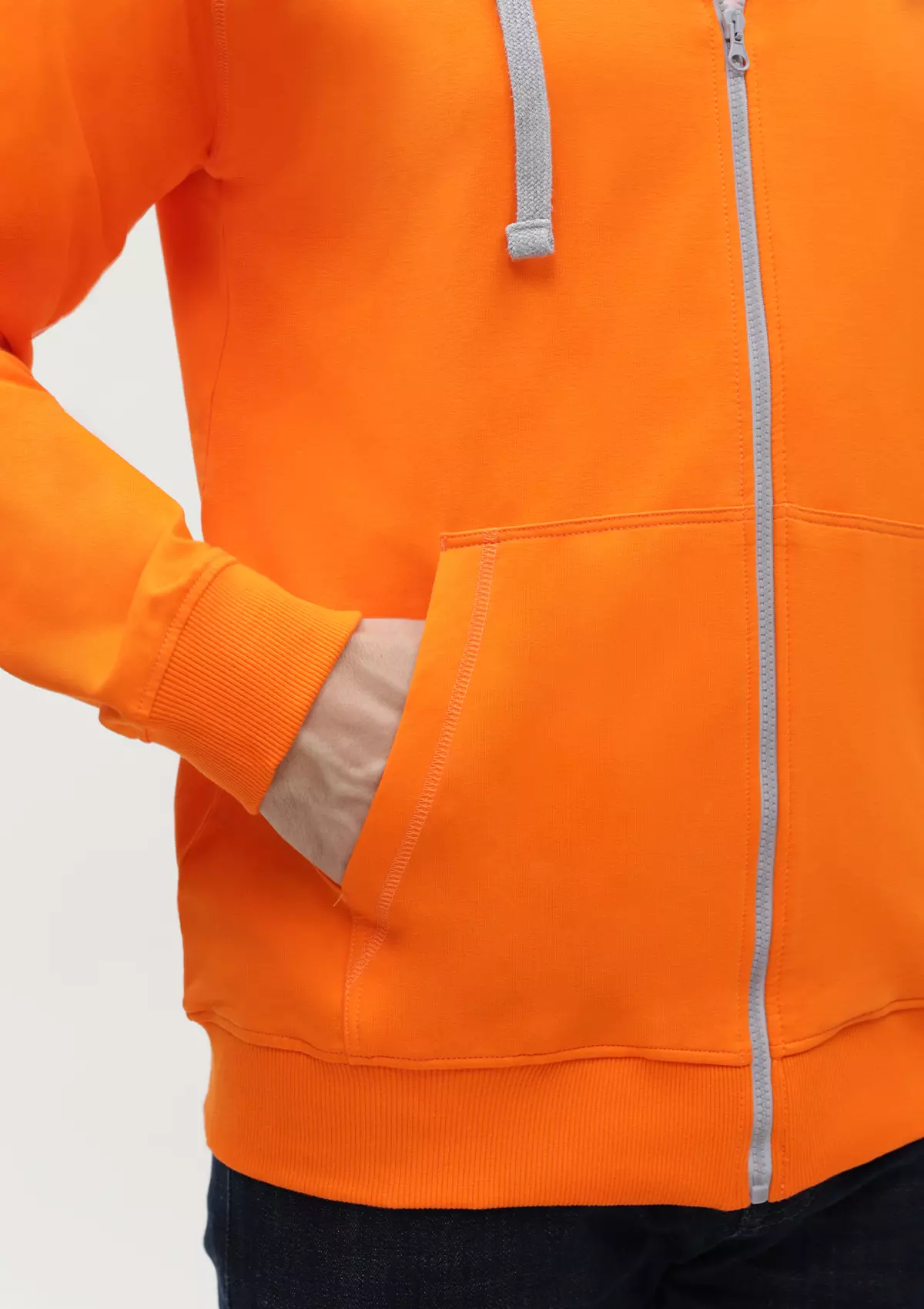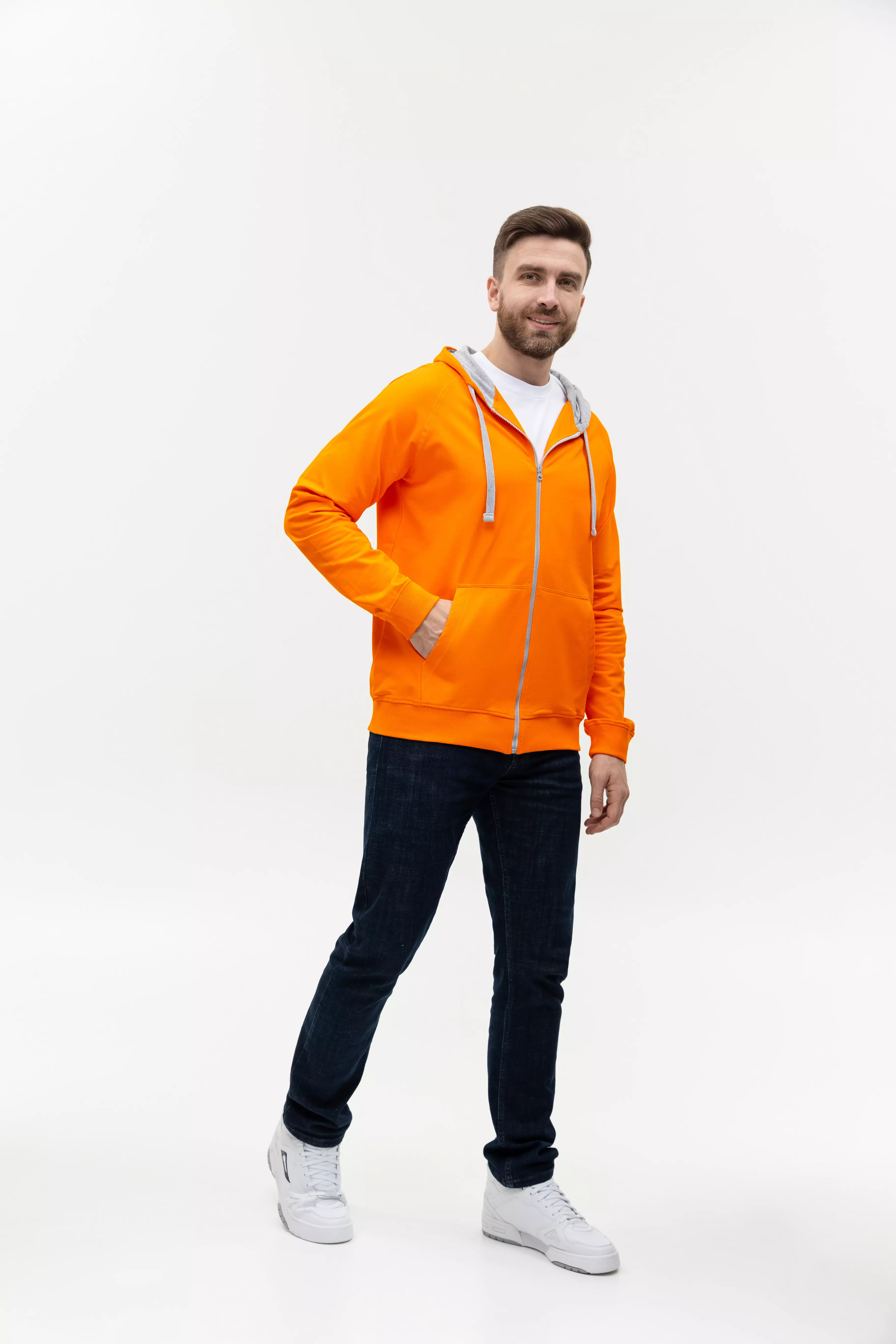 Мужская толстовка прямого силуэта с капюшоном комфортной глубины, рукавом-реглан, глубоким накладным карманом и застежкой на молнию контрастного цвета. Капюшон дополнен шнурком для регулирования прилегания, манжет и низ изделия оформлены широкой эластичной резинкой.