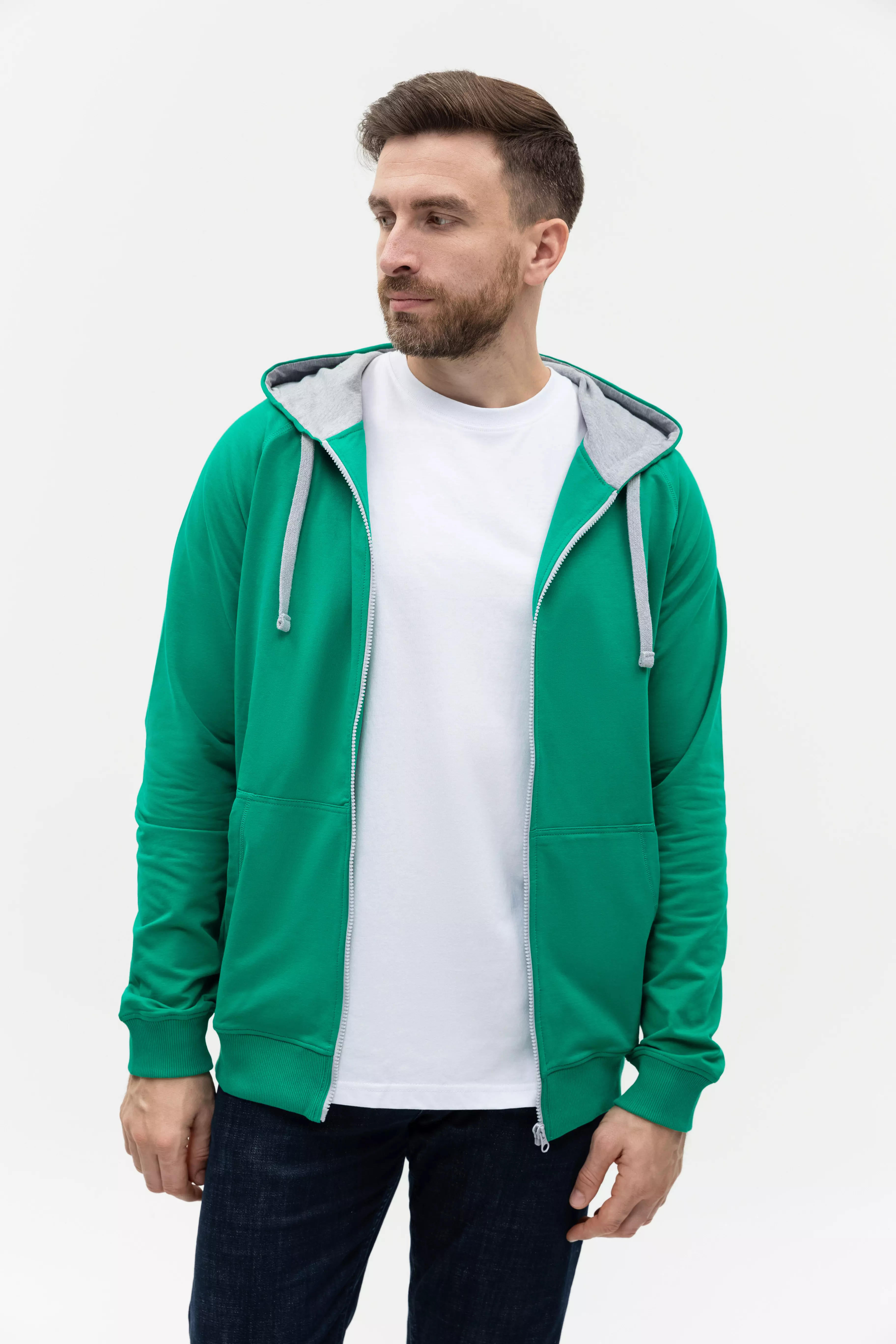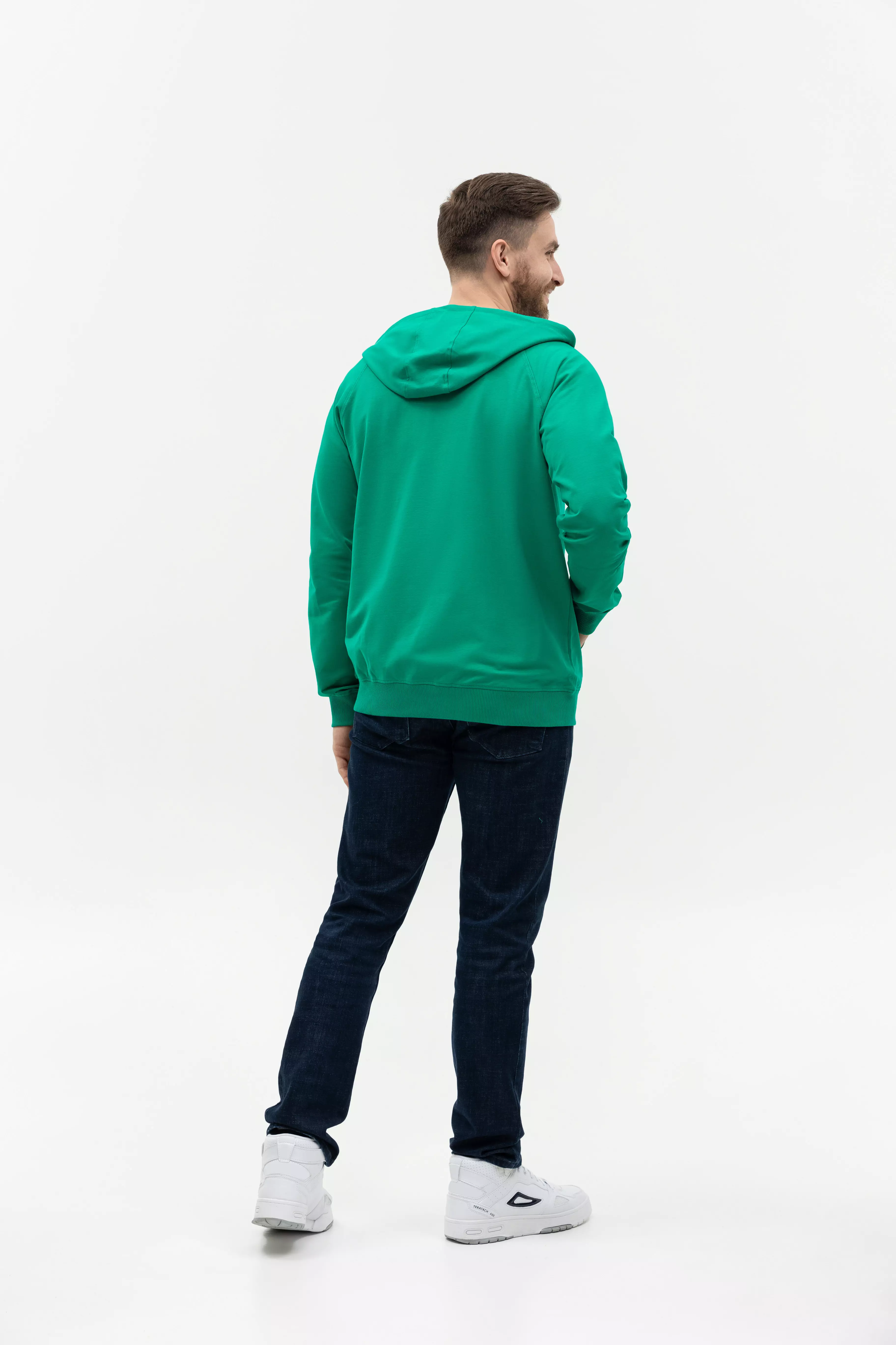 Мужская толстовка прямого силуэта с капюшоном комфортной глубины, рукавом-реглан, глубоким накладным карманом и застежкой на молнию контрастного цвета. Капюшон дополнен шнурком для регулирования прилегания, манжет и низ изделия оформлены широкой эластичной резинкой.