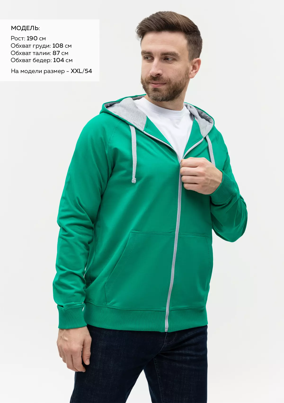 Размер мужской толстовки: XXL/54. Параметры модели: рост 190 см.; обхват груди 108 см.; обхват талии 87 см.; обхват бедер 104 см