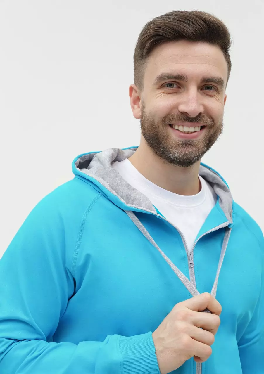 Мужская толстовка прямого силуэта с капюшоном комфортной глубины, рукавом-реглан, глубоким накладным карманом и застежкой на молнию контрастного цвета. Капюшон дополнен шнурком для регулирования прилегания, манжет и низ изделия оформлены широкой эластичной резинкой.