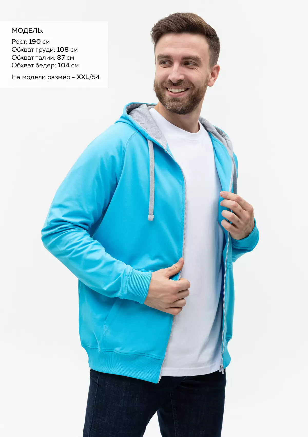 Размер мужской толстовки: XXL/54. Параметры модели: рост 190 см.; обхват груди 108 см.; обхват талии 87 см.; обхват бедер 104 см