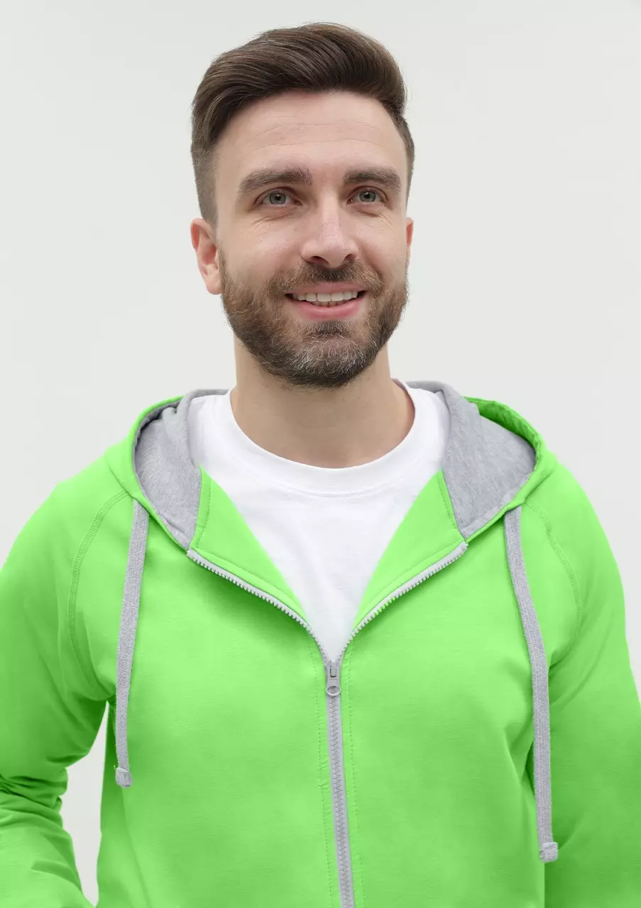 Мужская толстовка прямого силуэта с капюшоном комфортной глубины, рукавом-реглан, глубоким накладным карманом и застежкой на молнию контрастного цвета. Капюшон дополнен шнурком для регулирования прилегания, манжет и низ изделия оформлены широкой эластичной резинкой.