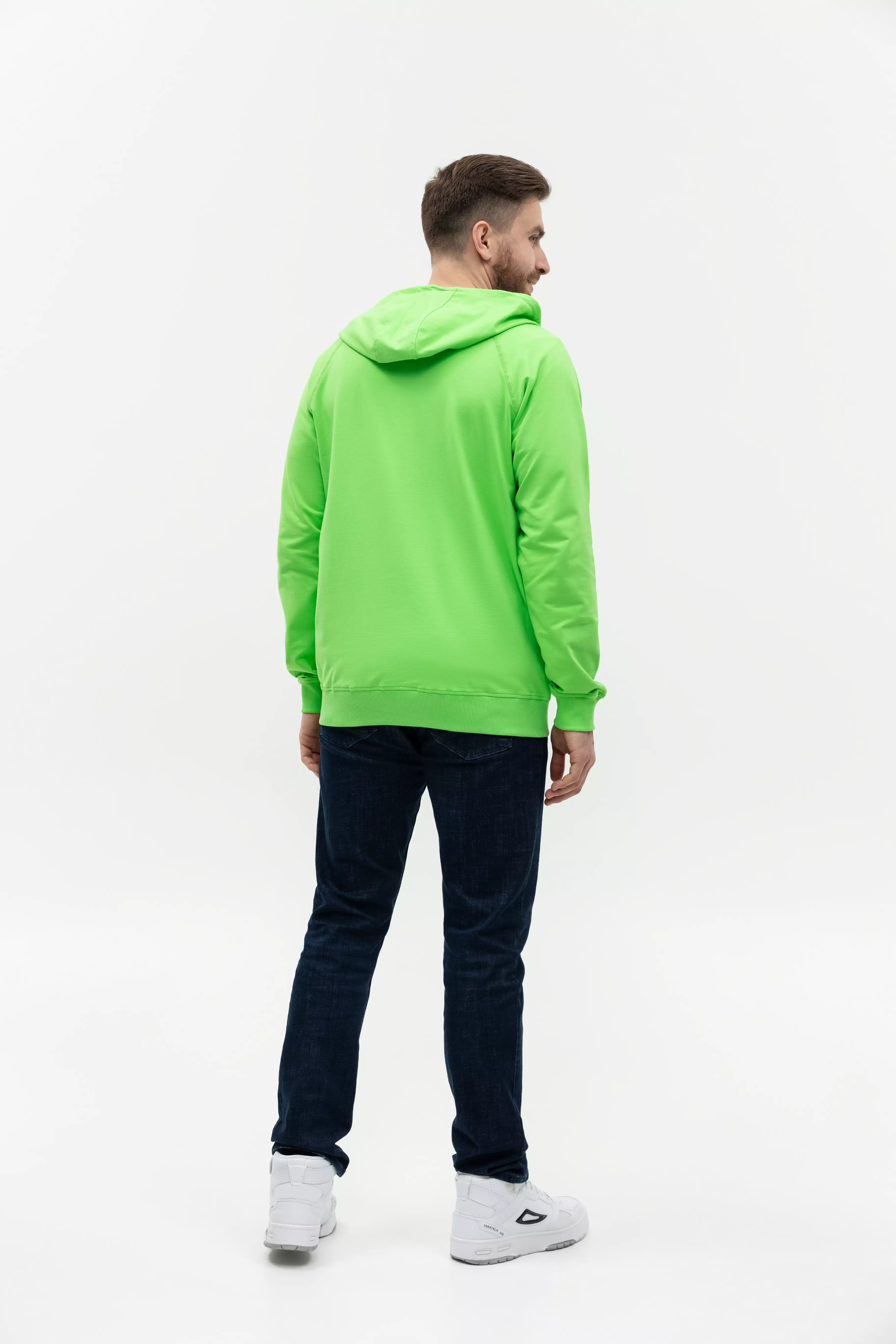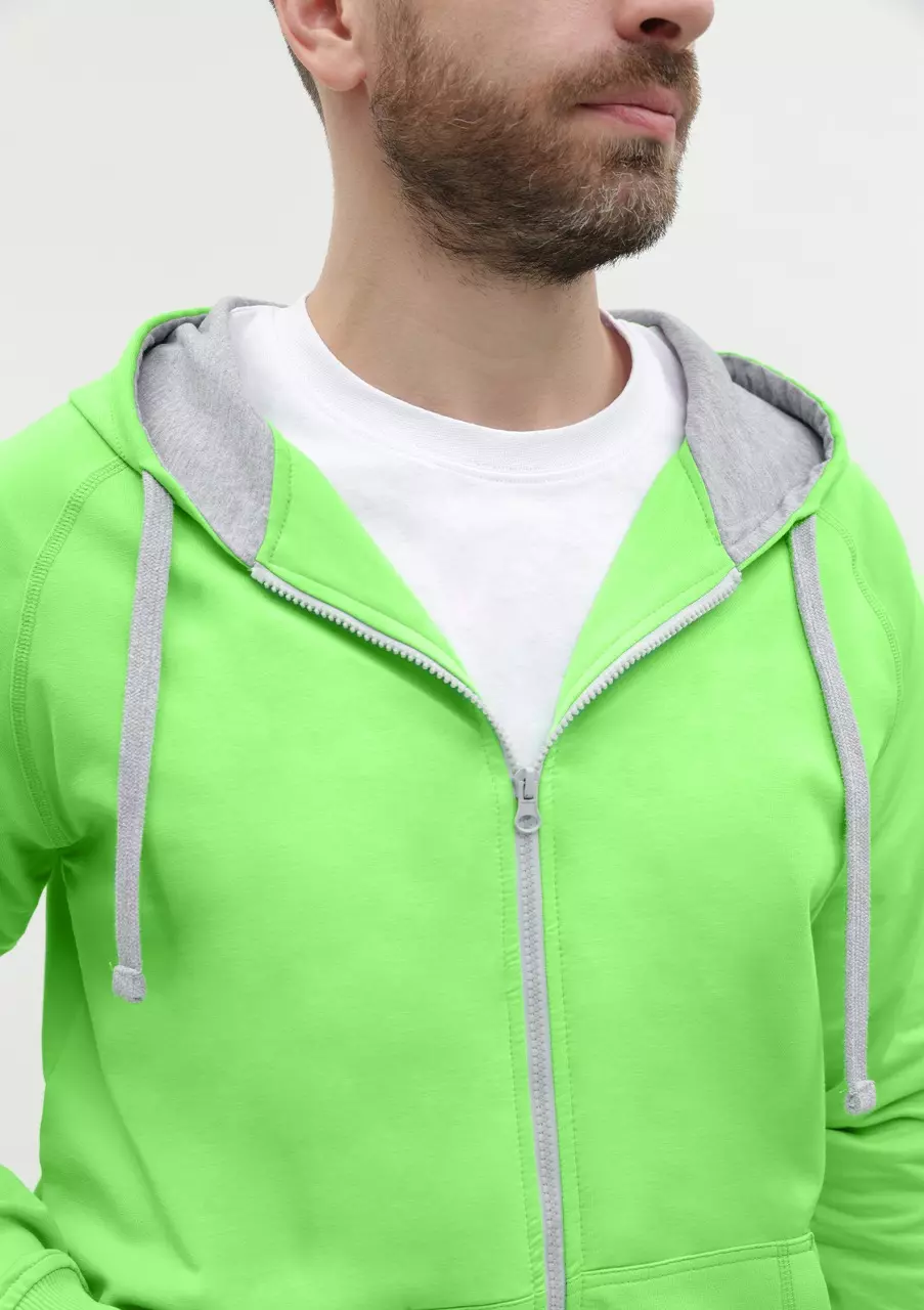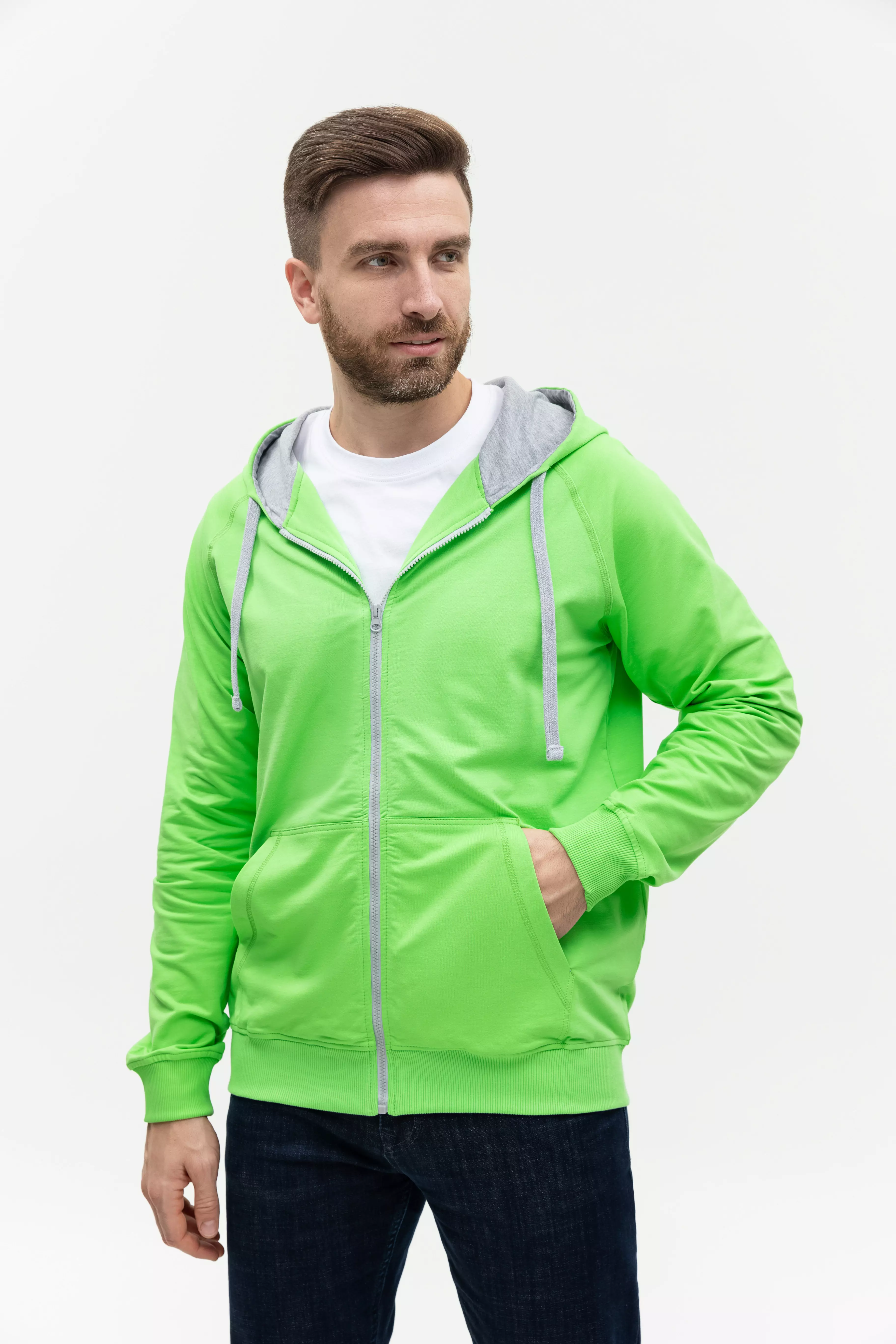 Мужская толстовка прямого силуэта с капюшоном комфортной глубины, рукавом-реглан, глубоким накладным карманом и застежкой на молнию контрастного цвета. Капюшон дополнен шнурком для регулирования прилегания, манжет и низ изделия оформлены широкой эластичной резинкой.