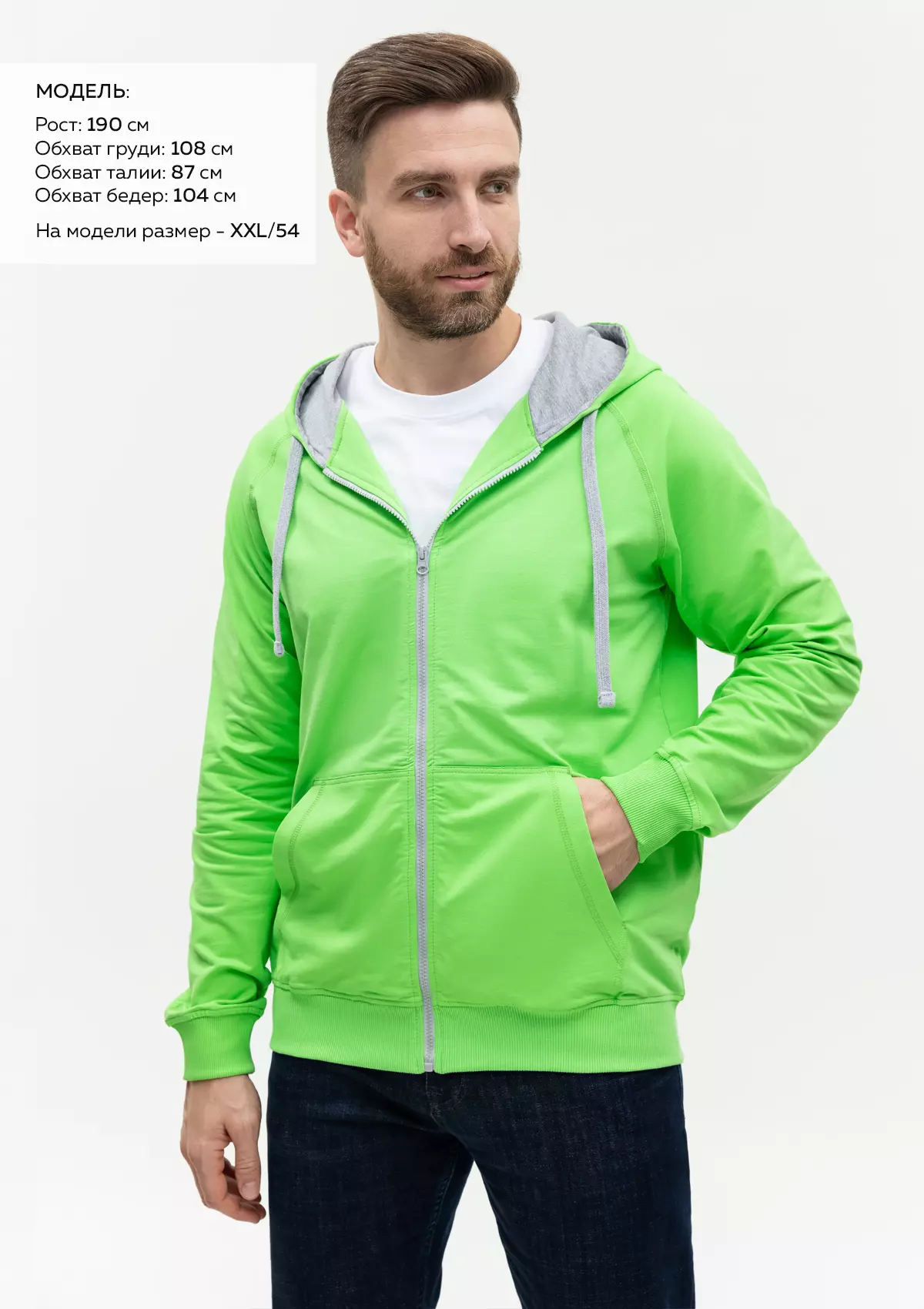 Размер мужской толстовки: XXL/54. Параметры модели: рост 190 см.; обхват груди 108 см.; обхват талии 87 см.; обхват бедер 104 см