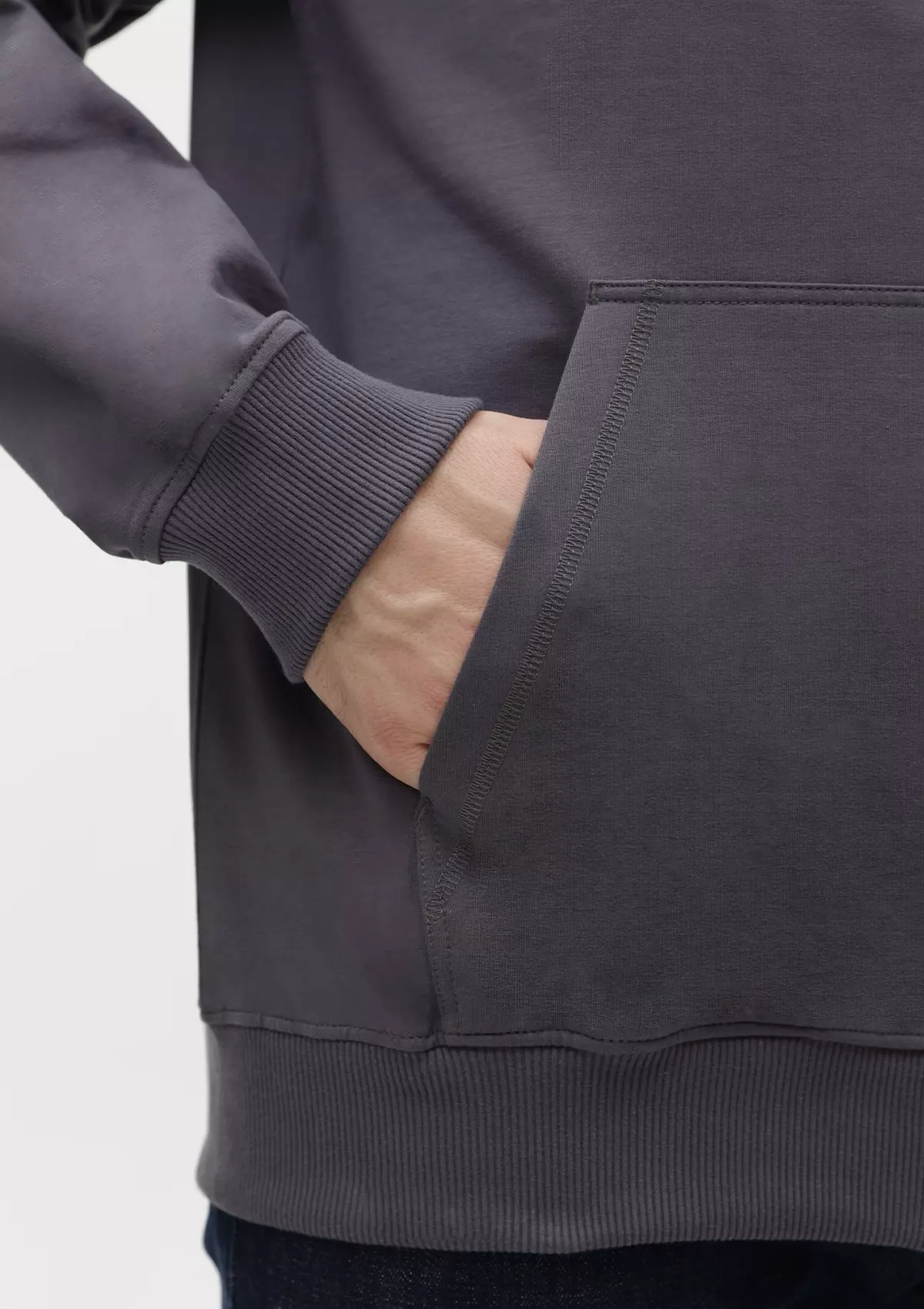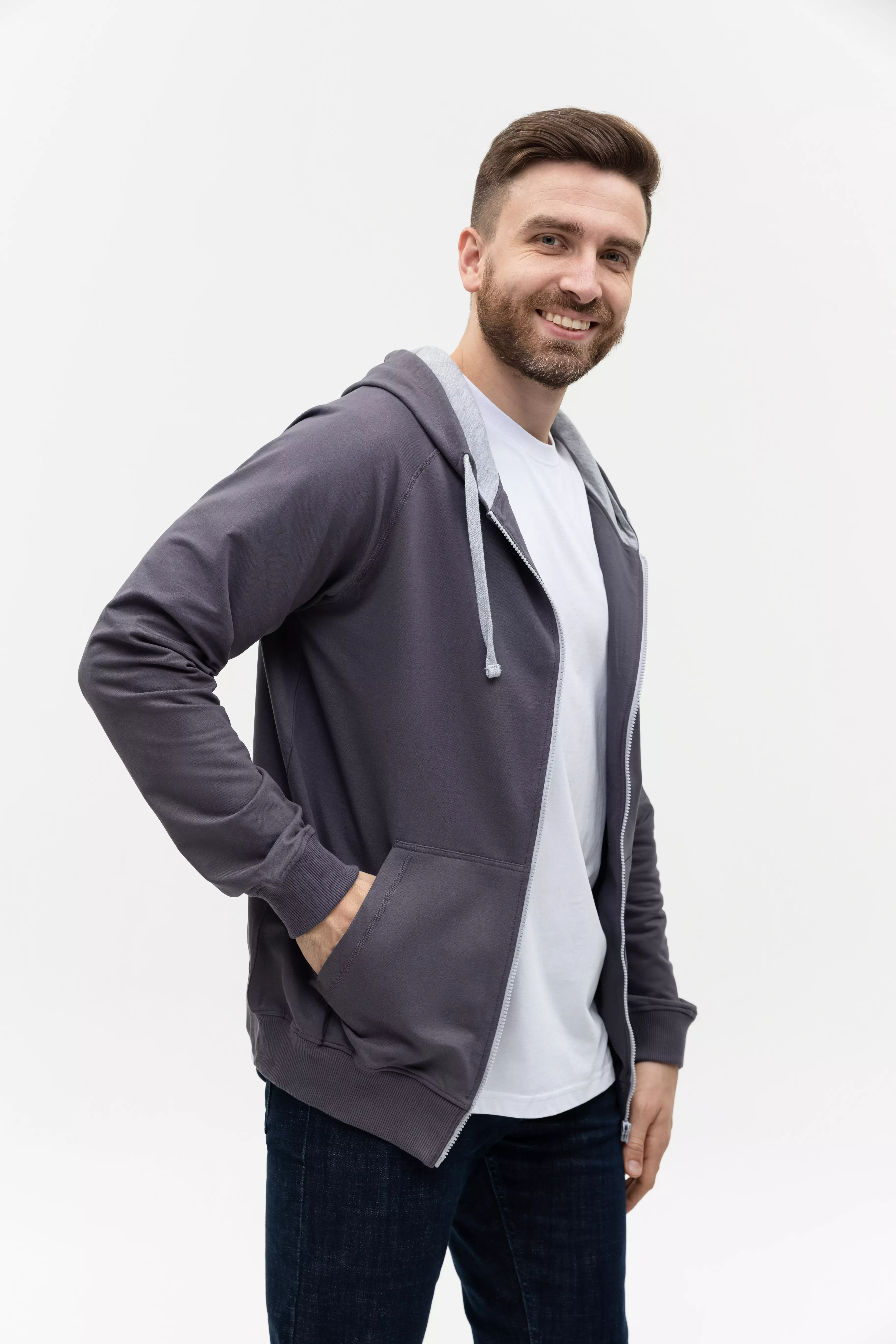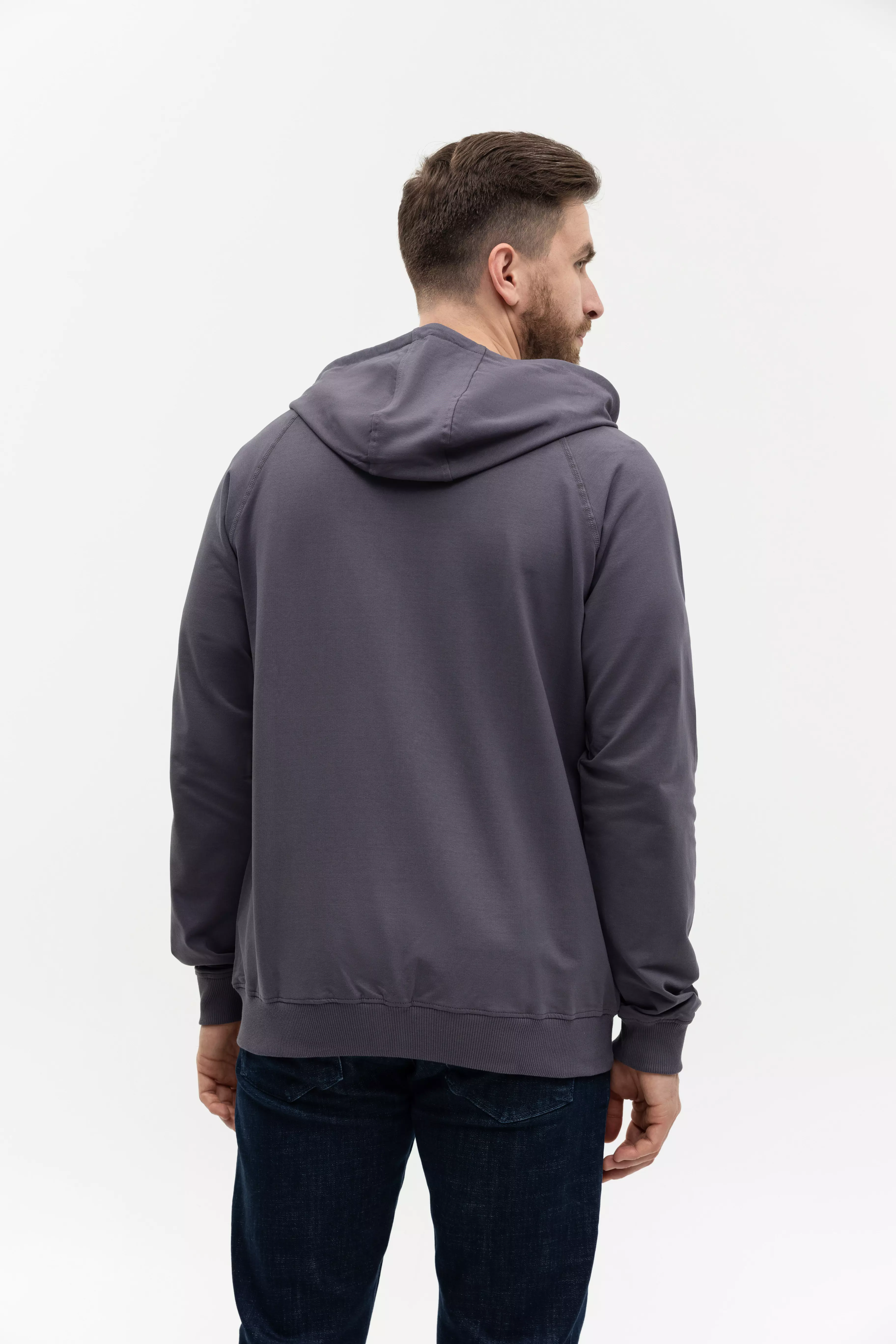 Мужская толстовка прямого силуэта с капюшоном комфортной глубины, рукавом-реглан, глубоким накладным карманом и застежкой на молнию контрастного цвета. Капюшон дополнен шнурком для регулирования прилегания, манжет и низ изделия оформлены широкой эластичной резинкой.
