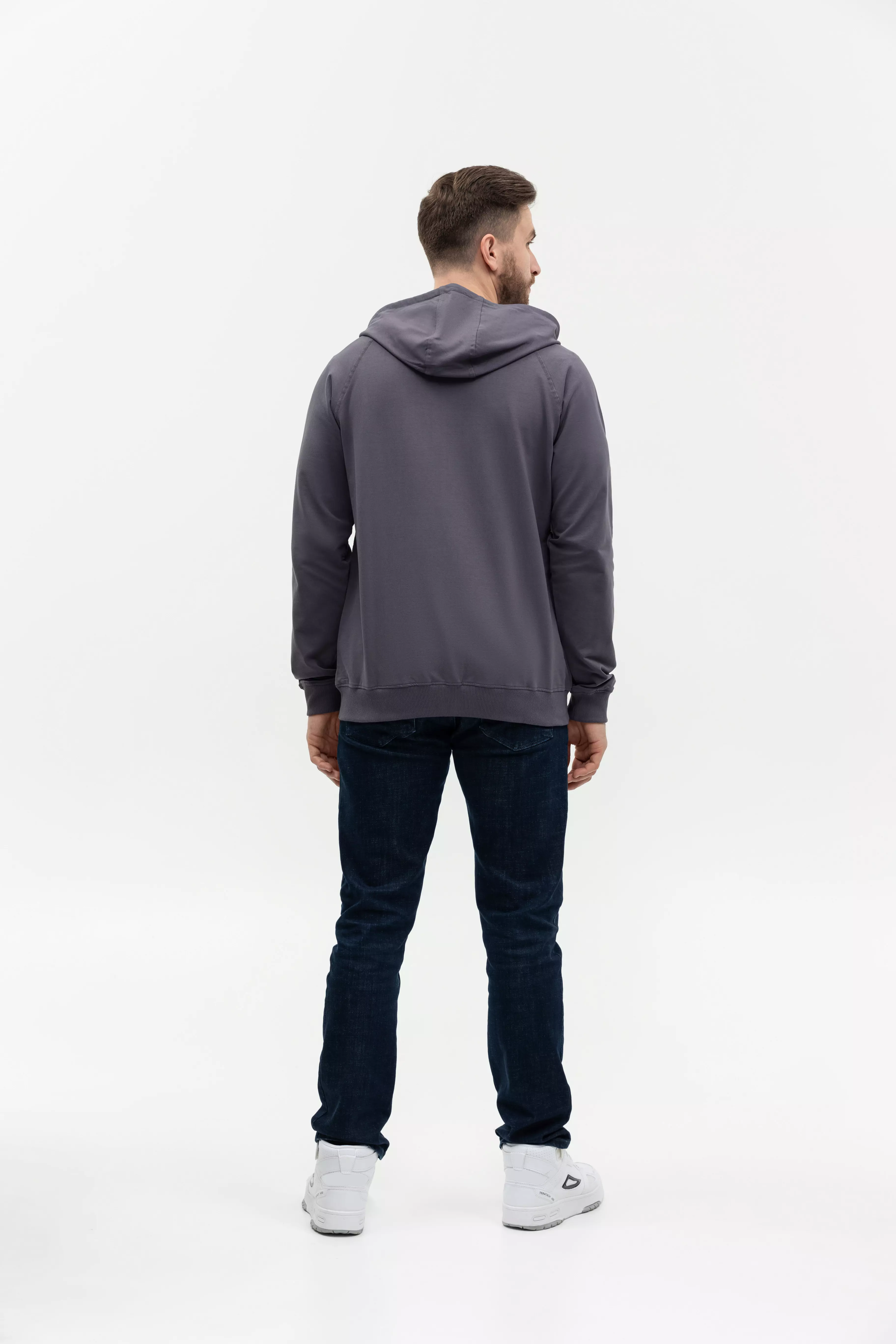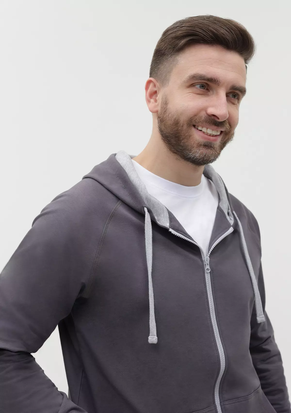 Мужская толстовка прямого силуэта с капюшоном комфортной глубины, рукавом-реглан, глубоким накладным карманом и застежкой на молнию контрастного цвета. Капюшон дополнен шнурком для регулирования прилегания, манжет и низ изделия оформлены широкой эластичной резинкой.