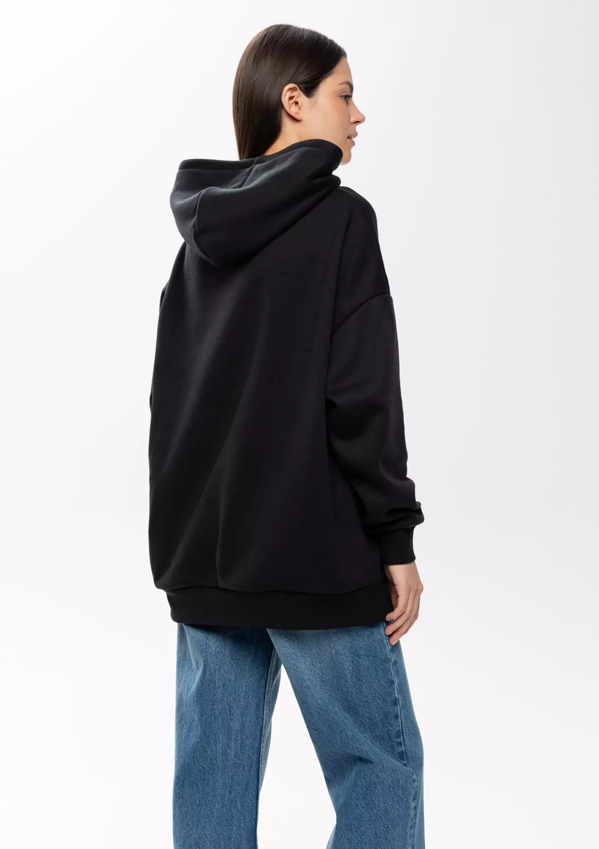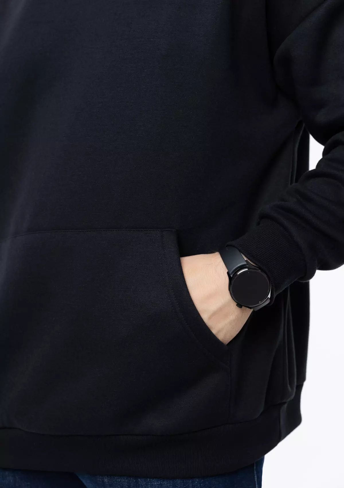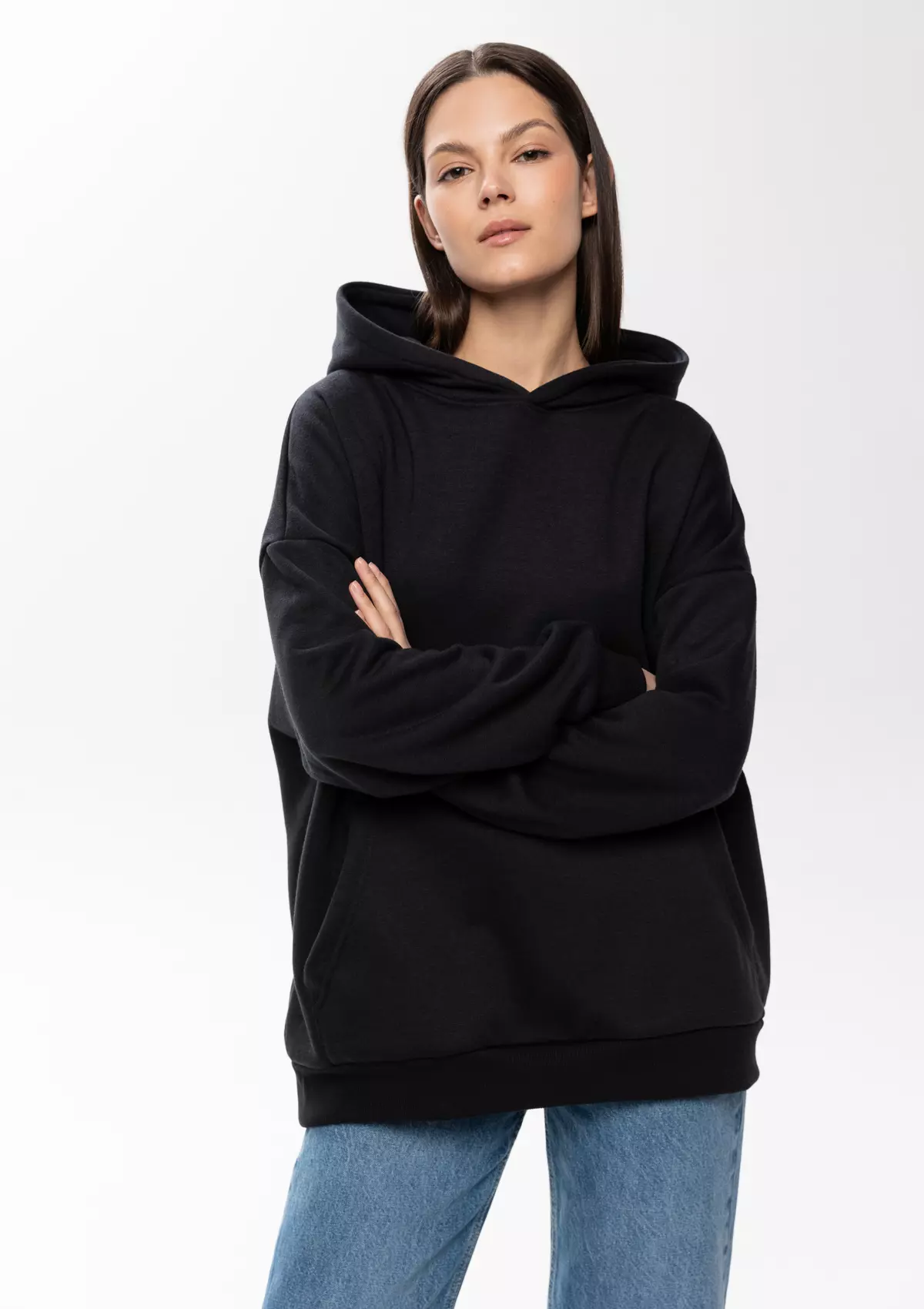 Толстовка свободного силуэта с капюшоном комфортной глубины, спущенной линией плеча и глубоким карманом-кенгуру. Манжет и низ изделия оформлены широкой эластичной резинкой в тон основному цвету.