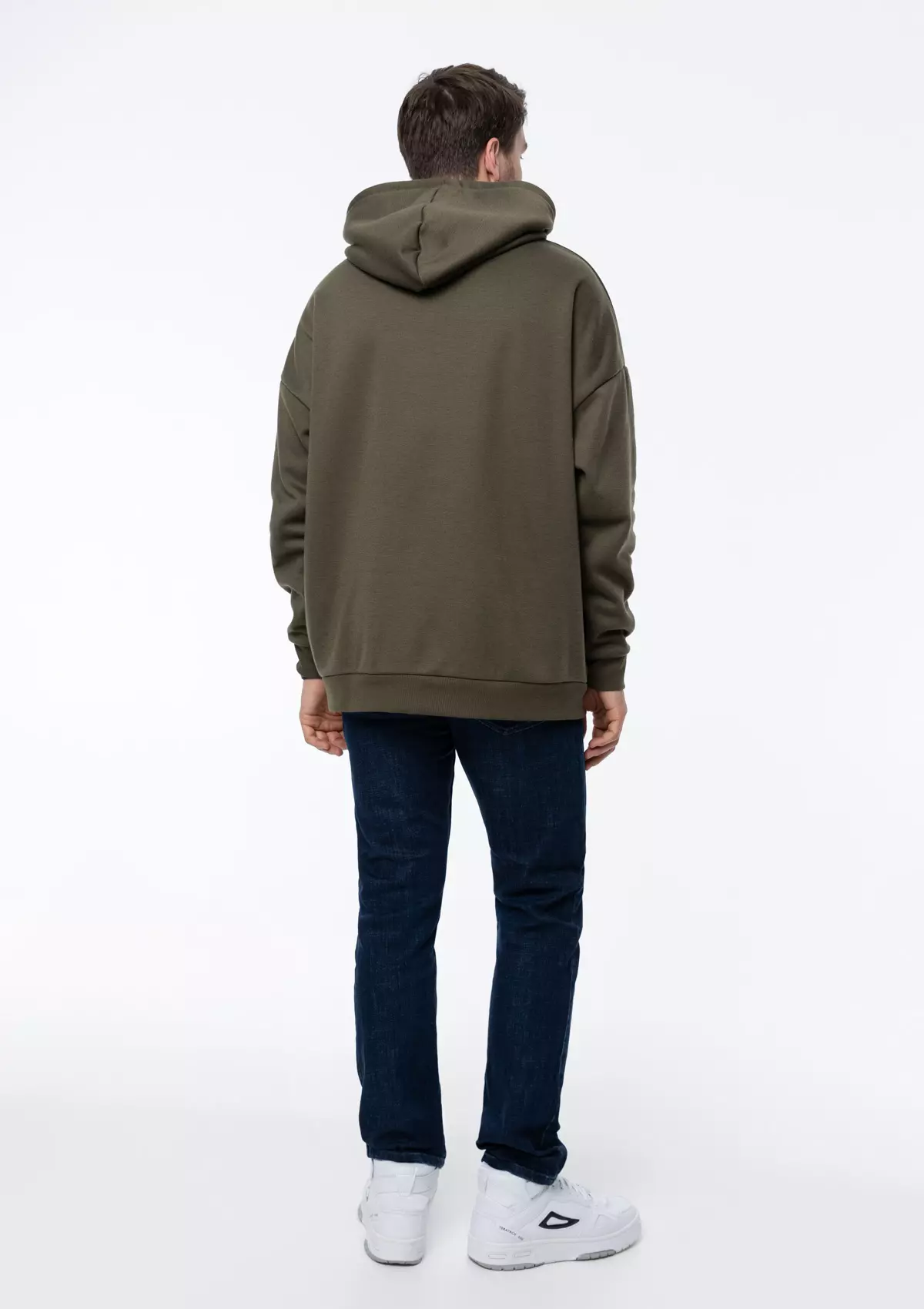 Толстовка свободного силуэта с капюшоном комфортной глубины, спущенной линией плеча и глубоким карманом-кенгуру. Манжет и низ изделия оформлены широкой эластичной резинкой в тон основному цвету.
