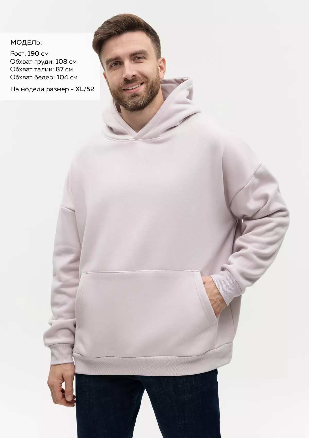 Размер мужского худи: XL/52. Параметры модели: рост 190 см.; обхват груди 108 см.; обхват талии 87 см.; обхват бедер 104 см.