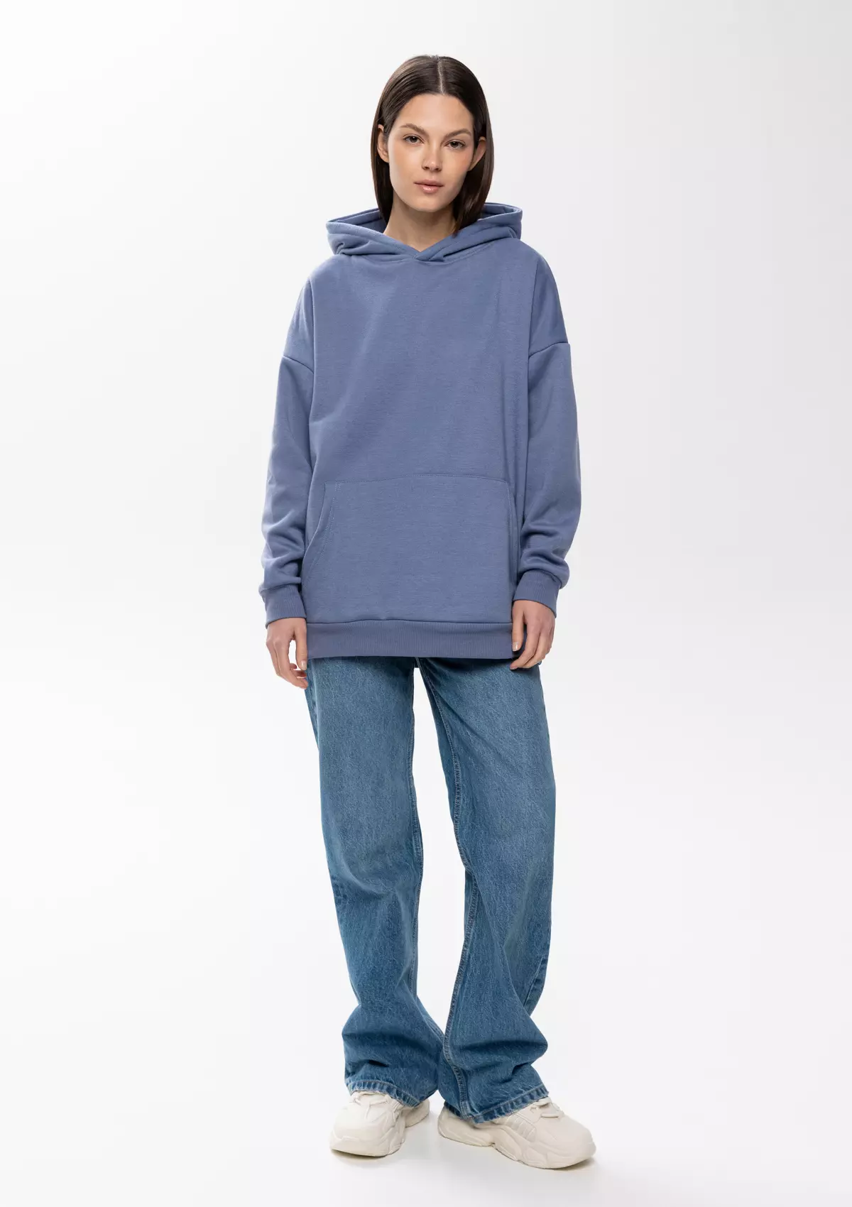 Толстовка свободного силуэта с капюшоном комфортной глубины, спущенной линией плеча и глубоким карманом-кенгуру. Манжет и низ изделия оформлены широкой эластичной резинкой в тон основному цвету.