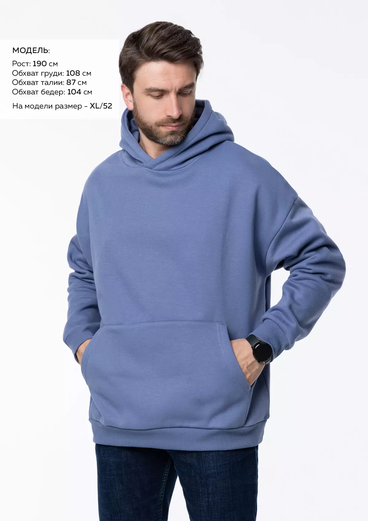 Размер мужского худи: XL/52. Параметры модели: рост 190 см.; обхват груди 108 см.; обхват талии 87 см.; обхват бедер 104 см.