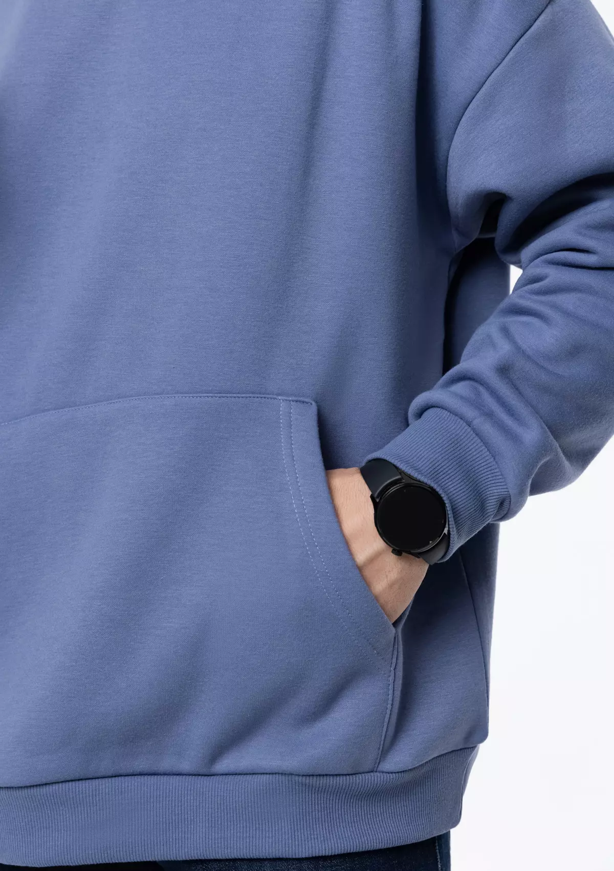Толстовка свободного силуэта с капюшоном комфортной глубины, спущенной линией плеча и глубоким карманом-кенгуру. Манжет и низ изделия оформлены широкой эластичной резинкой в тон основному цвету.