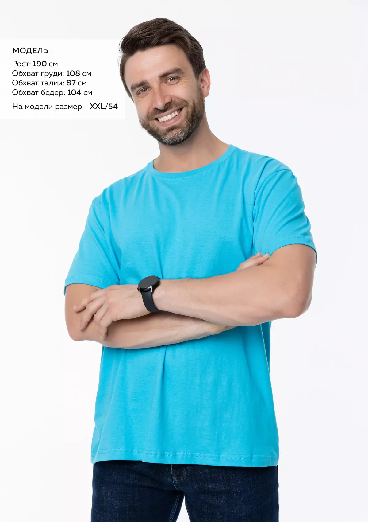 Размер мужской футболки: XXL/54. Параметры модели: рост 190 см.; обхват груди 108 см.; обхват талии 87 см.; обхват бедер 104 см.