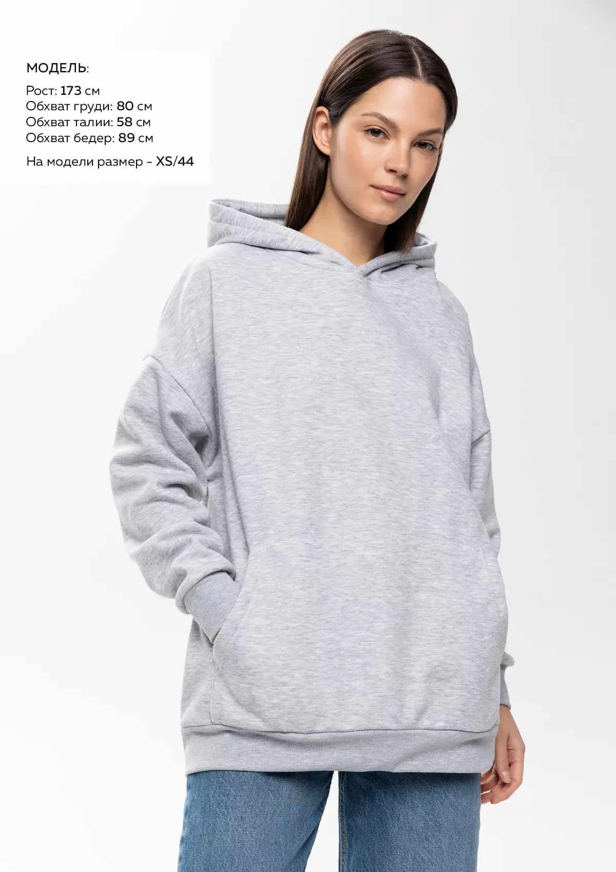 Размер женского худи: XS/44. Параметры модели: рост 173 см.; обхват груди 80 см.; обхват талии 58 см.; обхват бедер 89 см.
