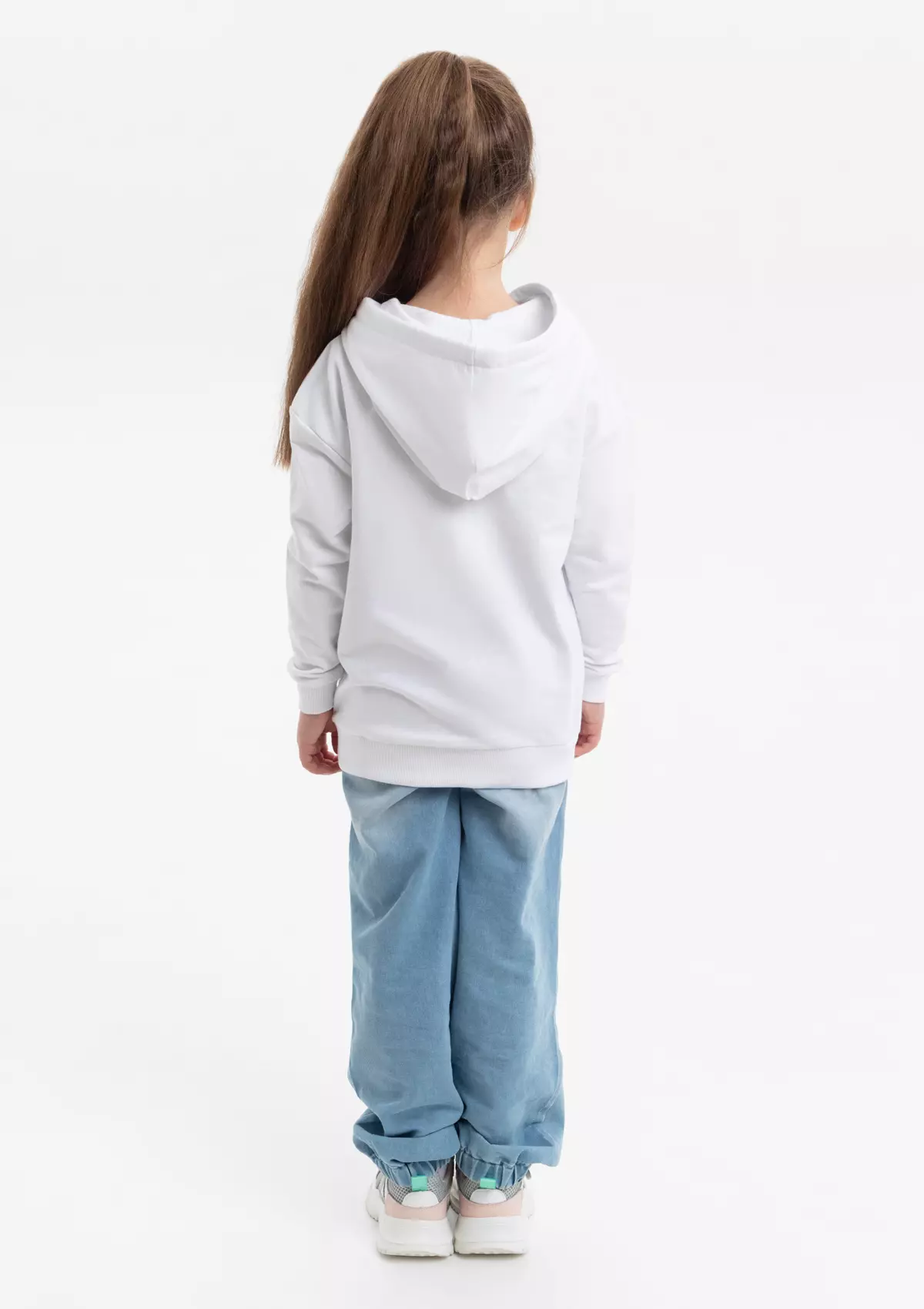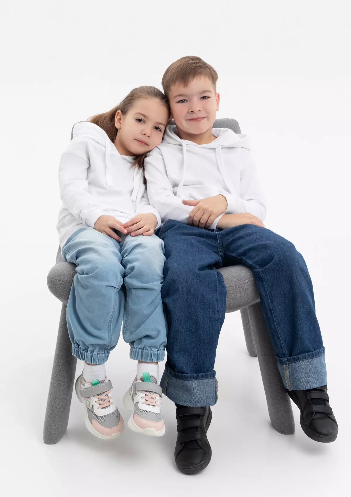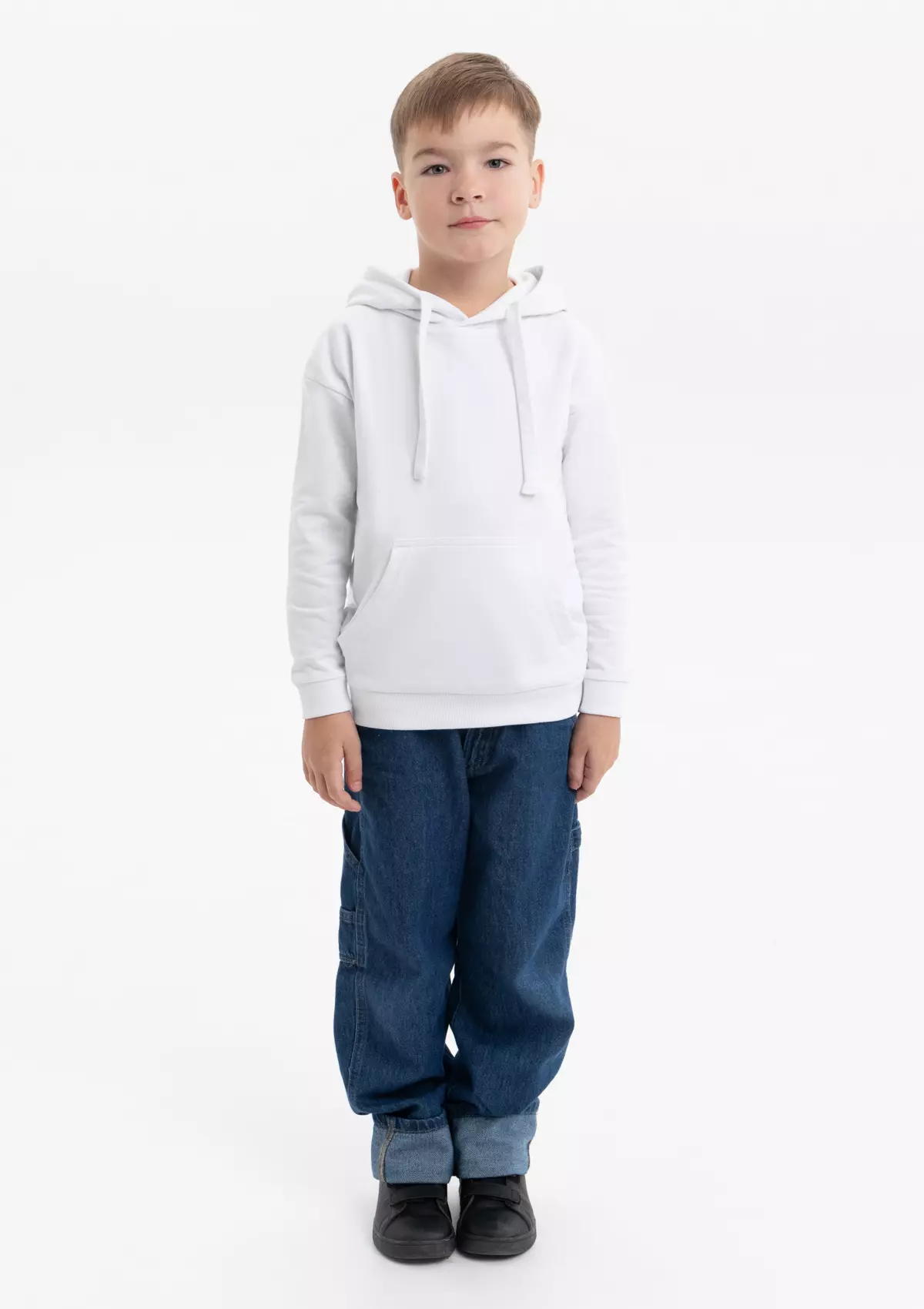 Модель прямого силуэта с капюшоном комфортной глубины, спущенной линией плеча и накладным карманом-кенгуру. Капюшон регулируется плоским шнуром, горловина спинки усилена киперной лентой. Манжет и низ изделия выполнены широкой эластичной резинкой в тон основному цвету.