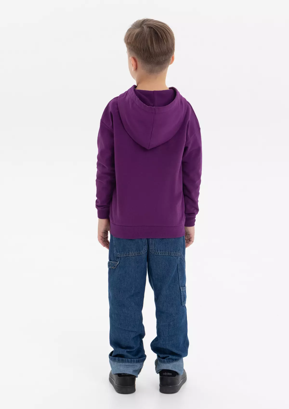 Модель прямого силуэта с капюшоном комфортной глубины, спущенной линией плеча и накладным карманом-кенгуру. Капюшон регулируется плоским шнуром, горловина спинки усилена киперной лентой. Манжет и низ изделия выполнены широкой эластичной резинкой в тон основному цвету.