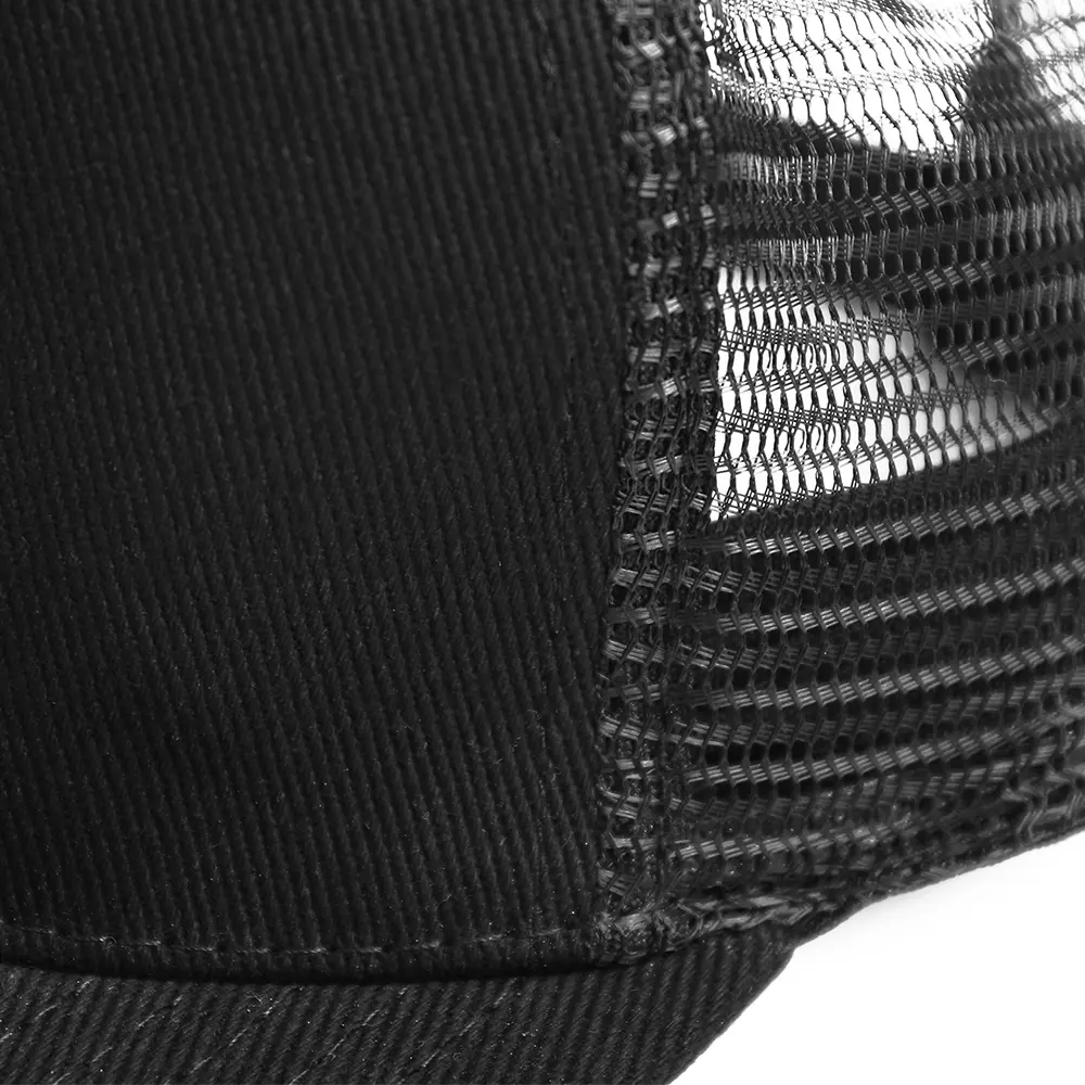 Бейсболка-пятиклинка с прямым жестким козырьком и пластиковой регулируемой застежкой, боковые клинья выполнены из жесткой сетки.