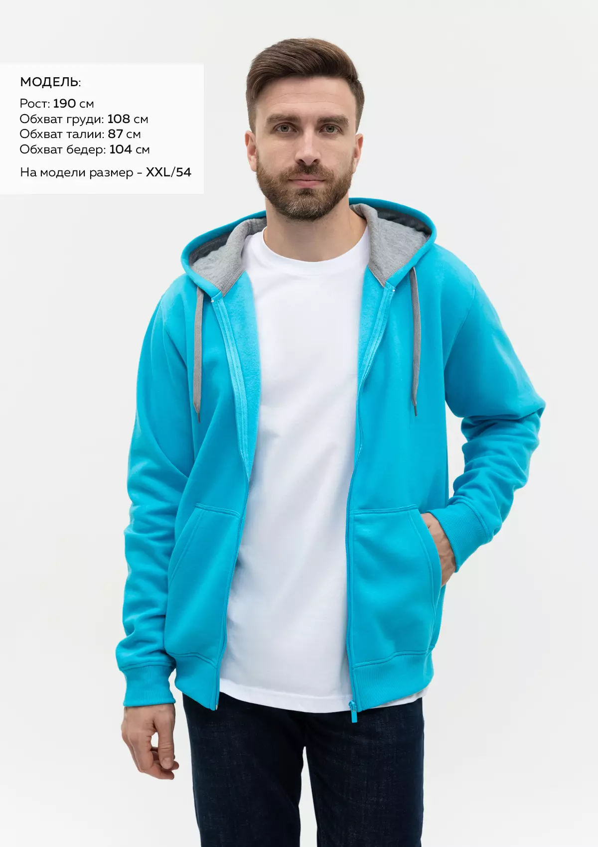 Размер мужской толстовки: XXL/54. Параметры модели: рост 190 см.; обхват груди 108 см.; обхват талии 87 см.; обхват бедер 104 см.