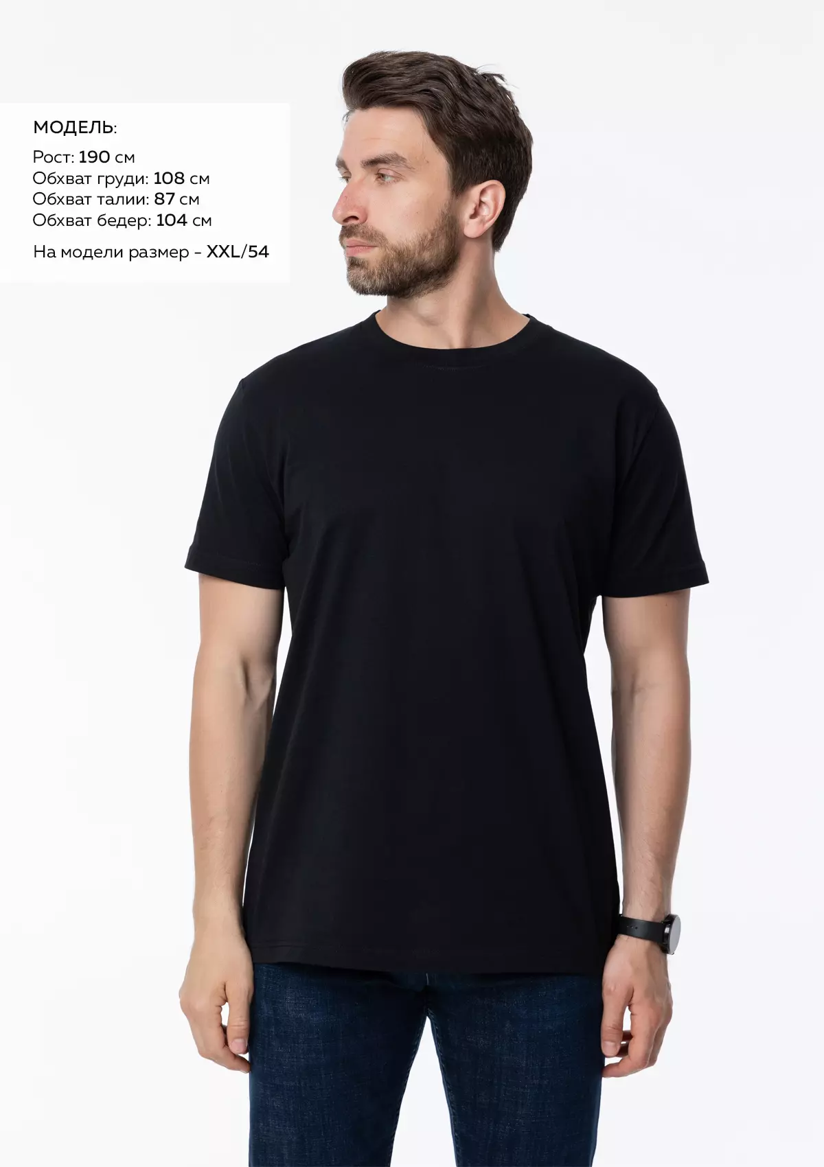 Размер мужской футболки: XXL/54. Параметры модели: рост 190 см.; обхват груди 108 см.; обхват талии 87 см.; обхват бедер 104 см.