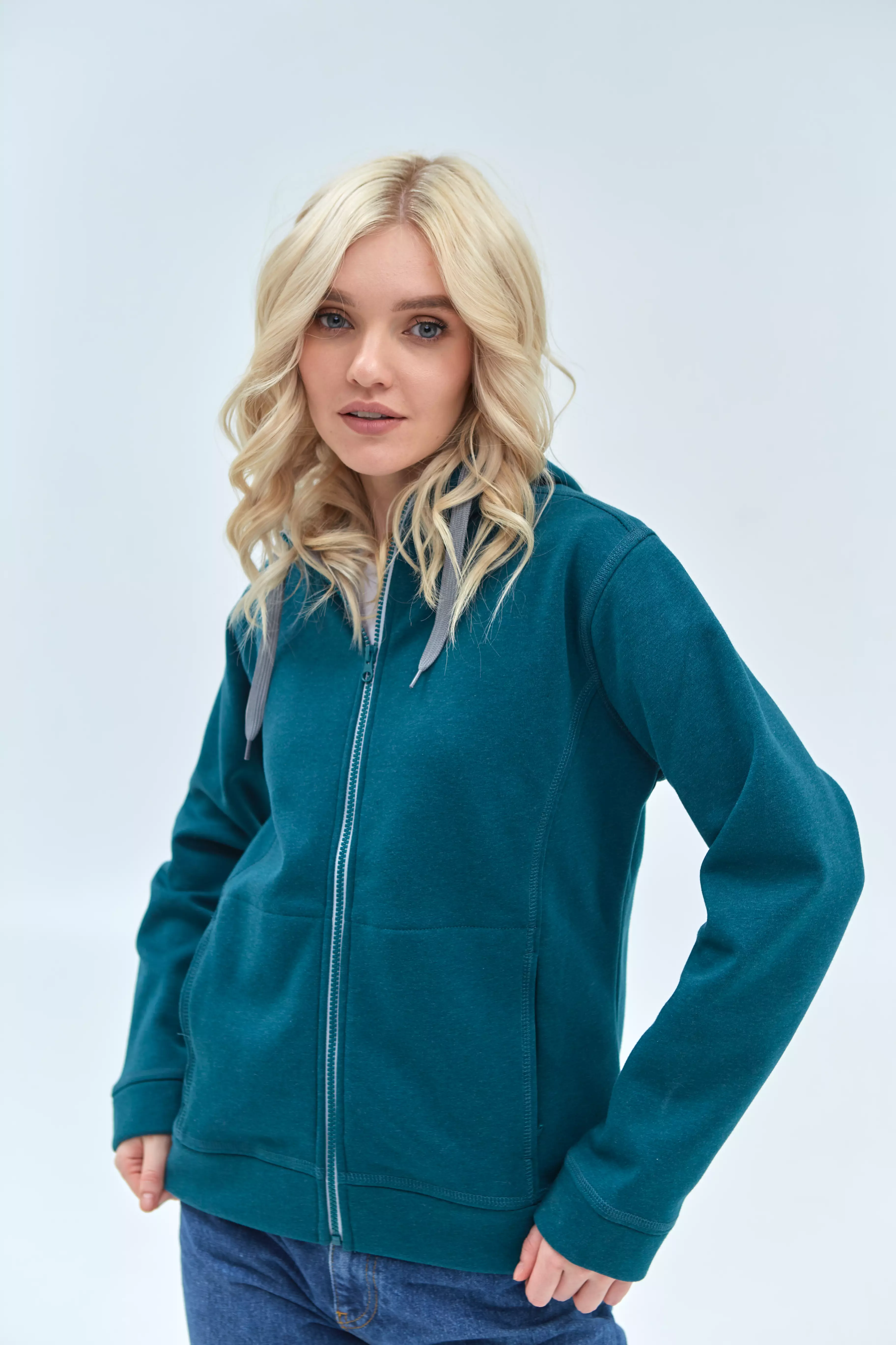 Женская толстовка прямого силуэта с капюшоном комфортной глубины, втачным рукавом, прорезным карманов и застежкой на контрастную молнию. Капюшон дополнен плоским шнурком для регулировки прилегания, манжет и низ изделия выполнены из основного полотна.