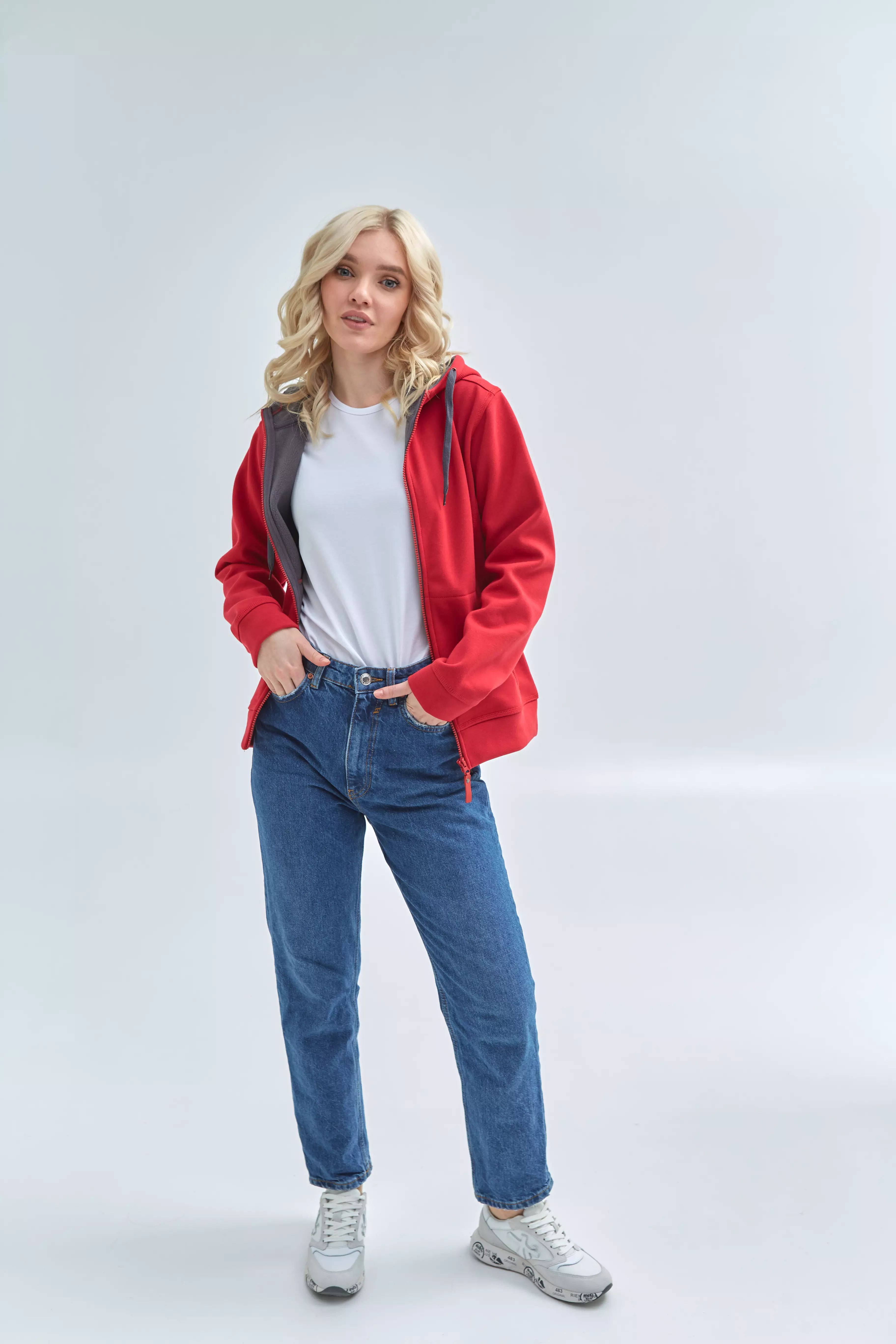 Женская толстовка прямого силуэта с капюшоном комфортной глубины, втачным рукавом, прорезным карманов и застежкой на контрастную молнию. Капюшон дополнен плоским шнурком для регулировки прилегания, манжет и низ изделия выполнены из основного полотна.