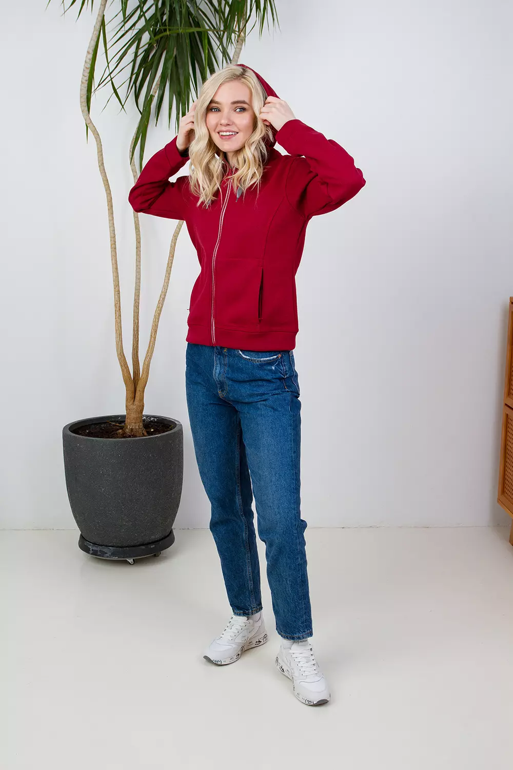 Женская толстовка прямого силуэта с капюшоном комфортной глубины, втачным рукавом, прорезным карманов и застежкой на контрастную молнию. Капюшон дополнен плоским шнурком для регулировки прилегания, манжет и низ изделия выполнены из основного полотна.