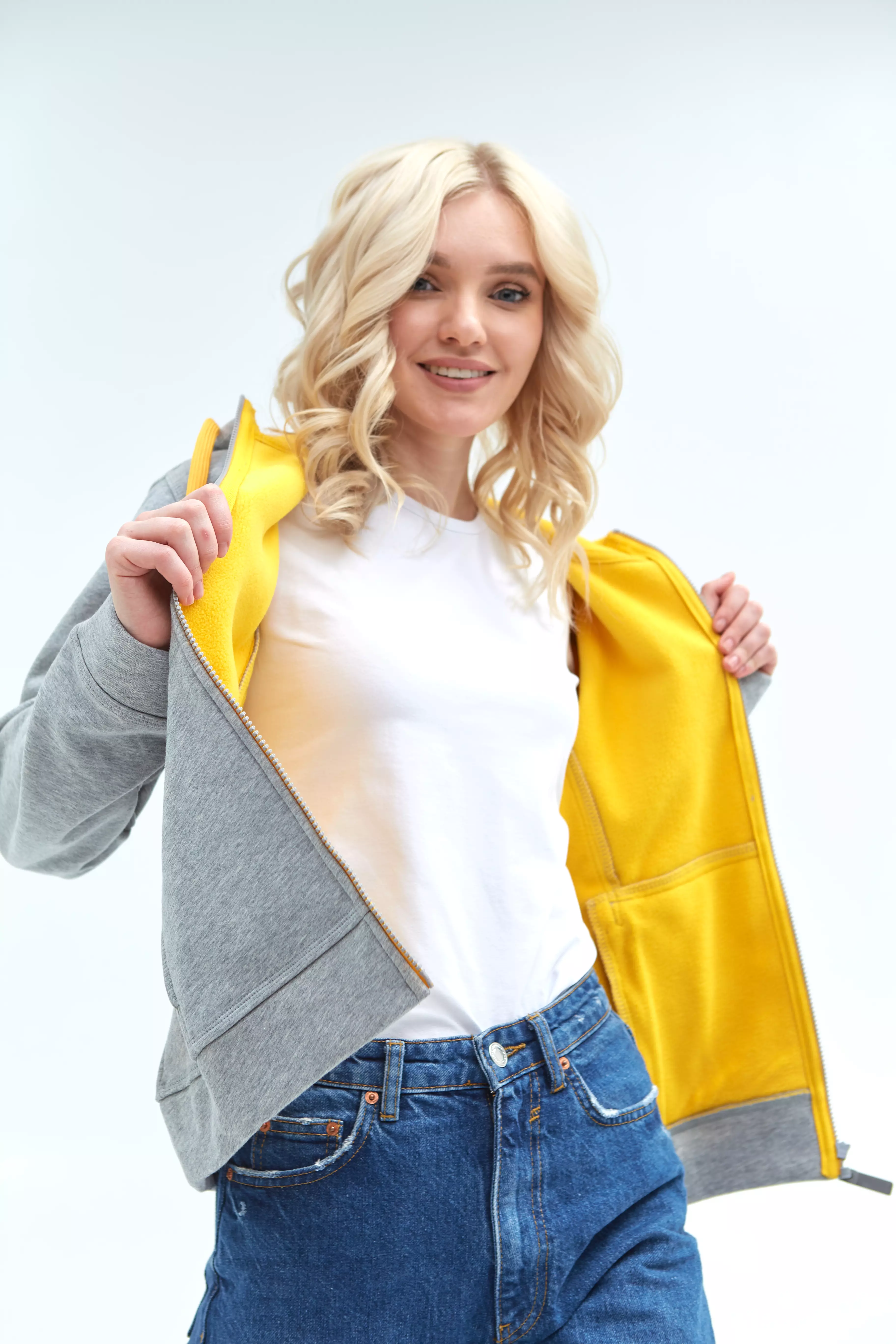 Женская толстовка прямого силуэта с капюшоном комфортной глубины, втачным рукавом, прорезным карманов и застежкой на контрастную молнию. Капюшон дополнен плоским шнурком для регулировки прилегания, манжет и низ изделия выполнены из основного полотна.