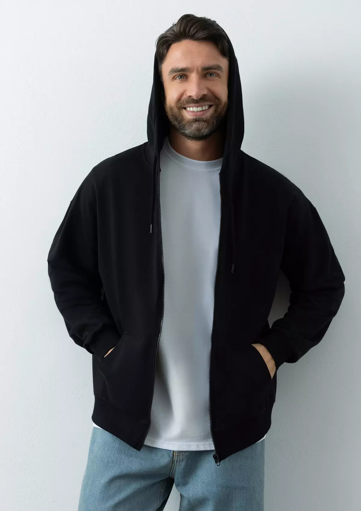 Толстовка оверсайз-силуэта с глубоким капюшоном, спущенной линией плеча, карманом-кенгуру и застежкой на молнию. Глубина капюшона регулируется шнурком с пластиковым наконечником, а рукав и низ изделия дополнены плотной эластичной резинкой.