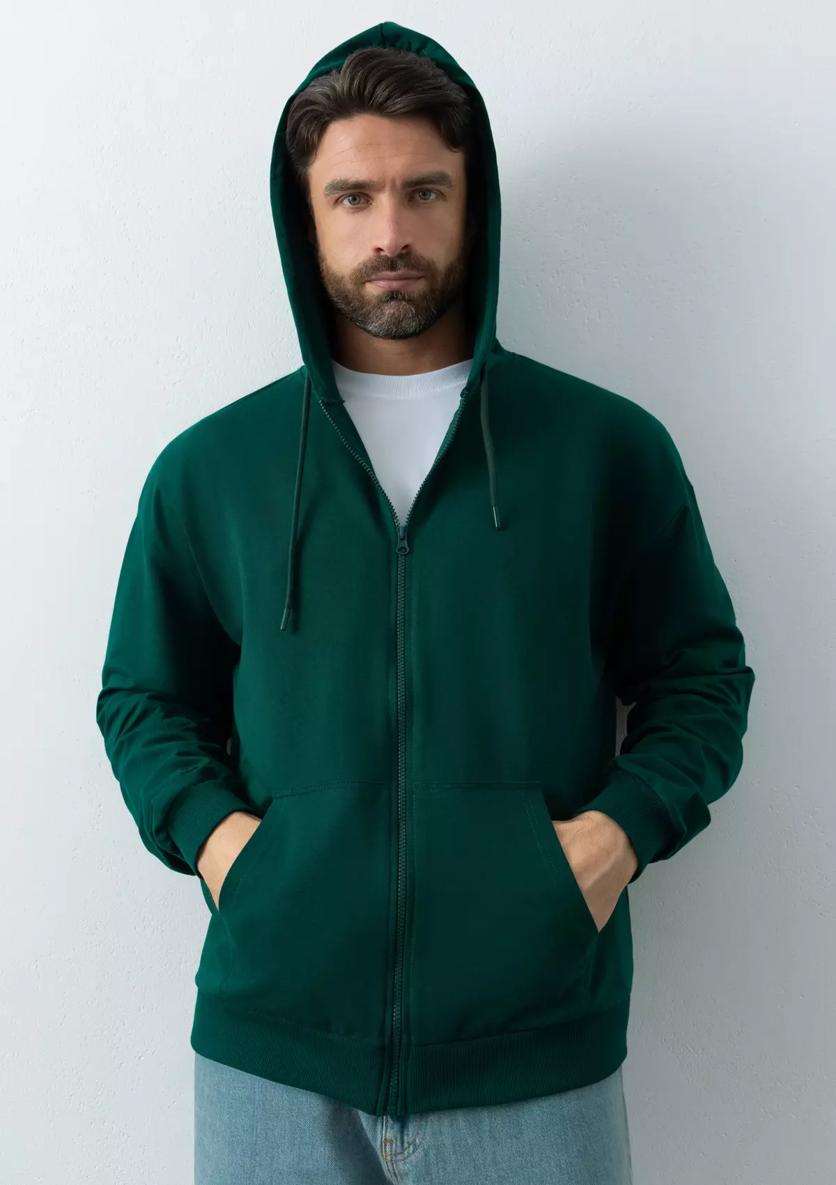 Толстовка оверсайз-силуэта с глубоким капюшоном, спущенной линией плеча, карманом-кенгуру и застежкой на молнию. Глубина капюшона регулируется шнурком с пластиковым наконечником, а рукав и низ изделия дополнены плотной эластичной резинкой.