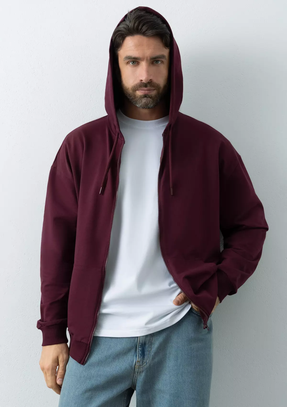 Толстовка оверсайз-силуэта с глубоким капюшоном, спущенной линией плеча, карманом-кенгуру и застежкой на молнию. Глубина капюшона регулируется шнурком с пластиковым наконечником, а рукав и низ изделия дополнены плотной эластичной резинкой.
