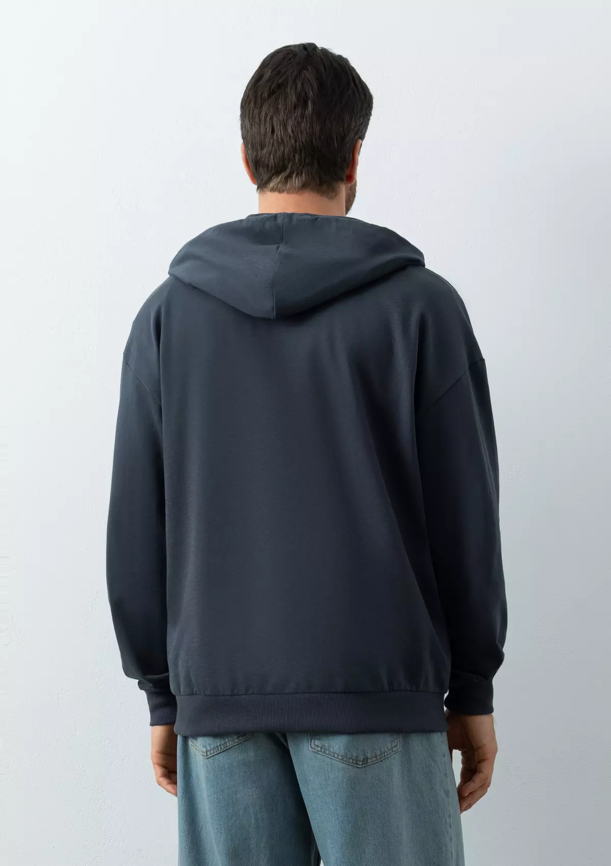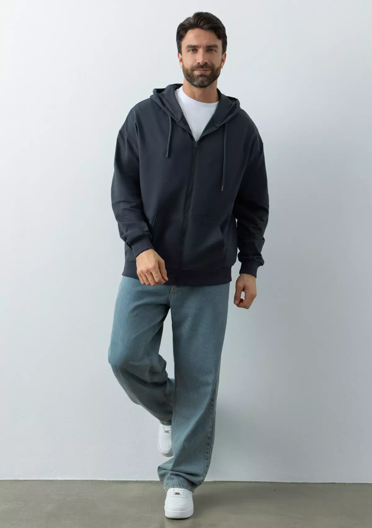 Толстовка оверсайз-силуэта с глубоким капюшоном, спущенной линией плеча, карманом-кенгуру и застежкой на молнию. Глубина капюшона регулируется шнурком с пластиковым наконечником, а рукав и низ изделия дополнены плотной эластичной резинкой.