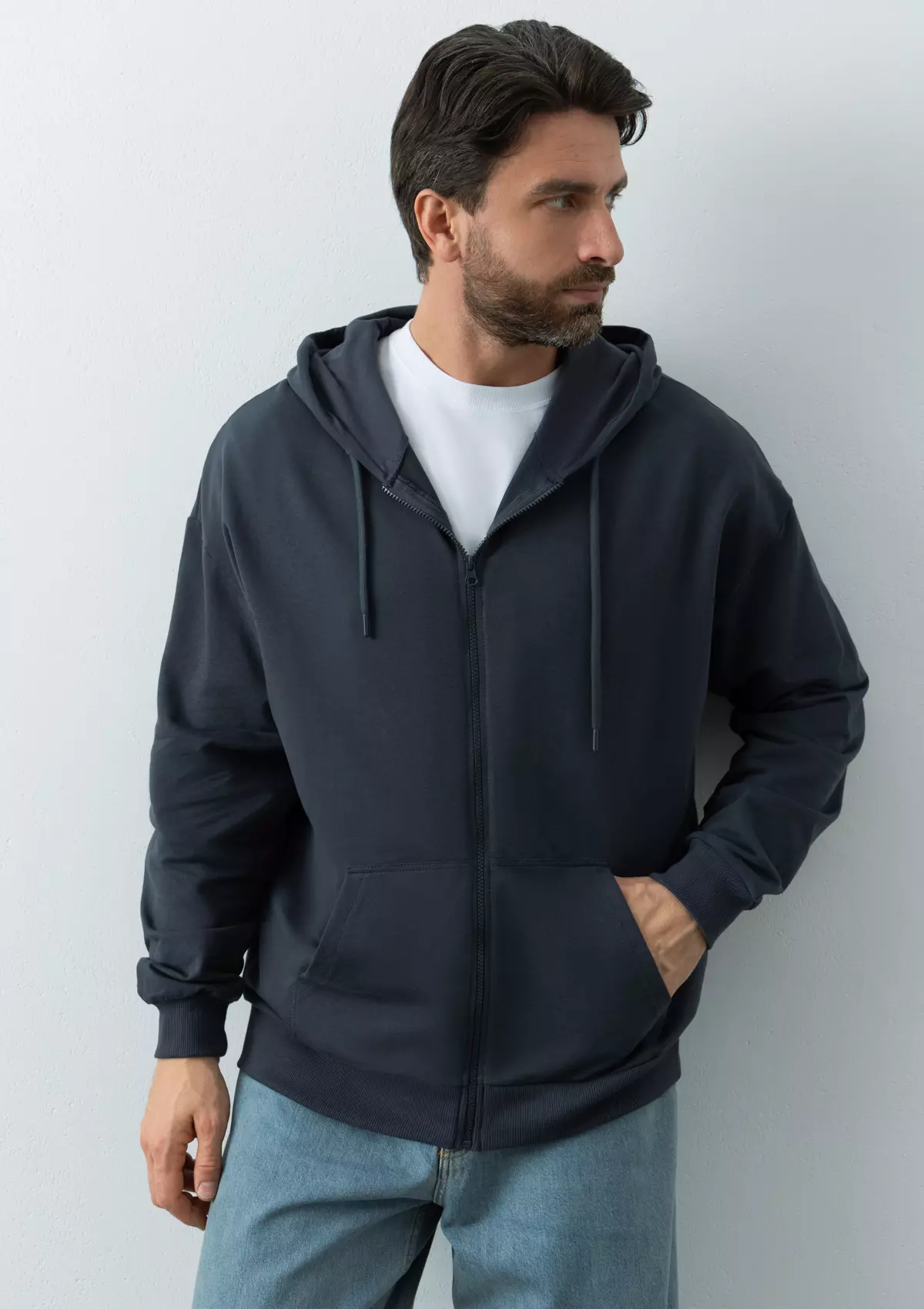 Толстовка оверсайз-силуэта с глубоким капюшоном, спущенной линией плеча, карманом-кенгуру и застежкой на молнию. Глубина капюшона регулируется шнурком с пластиковым наконечником, а рукав и низ изделия дополнены плотной эластичной резинкой.