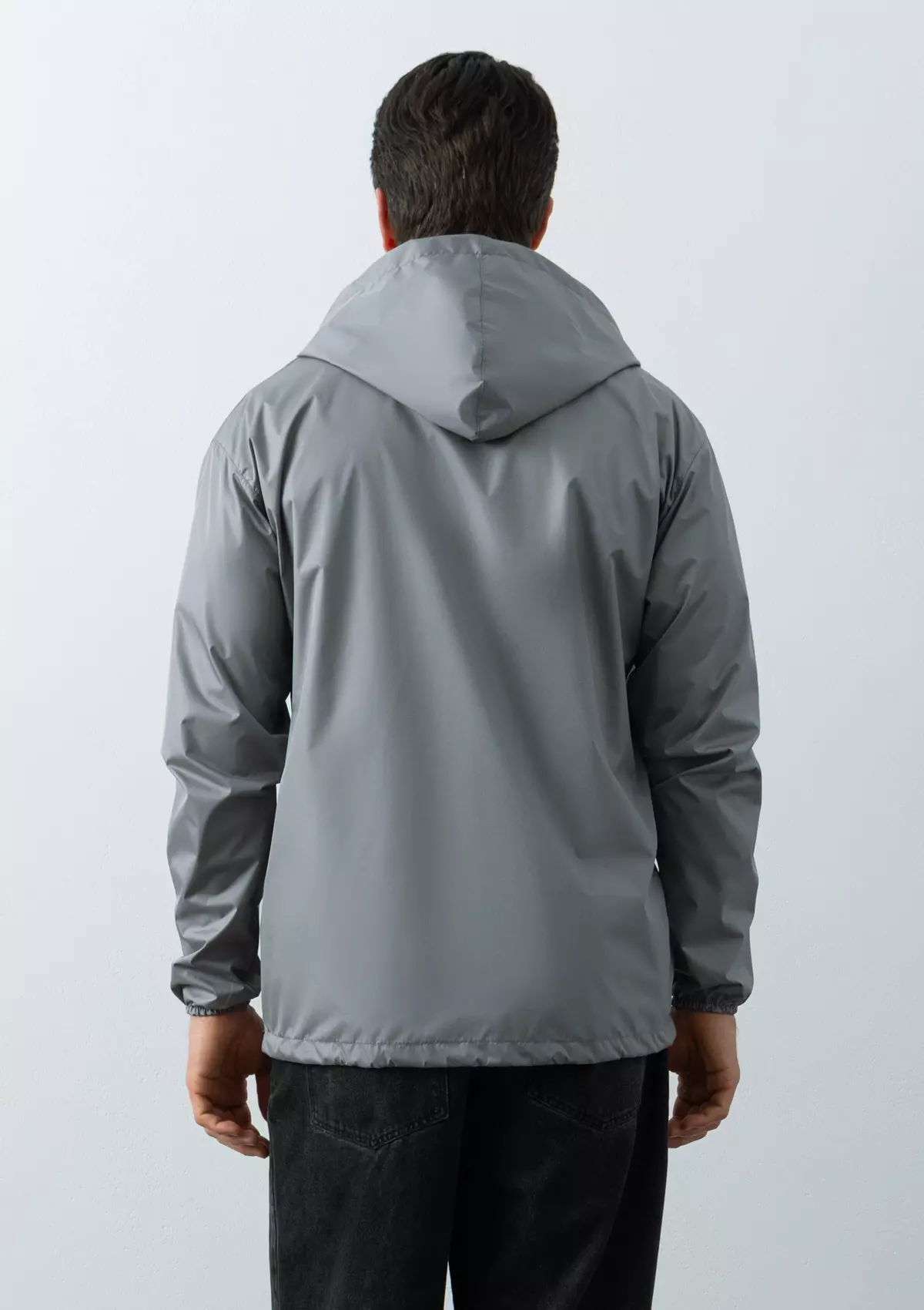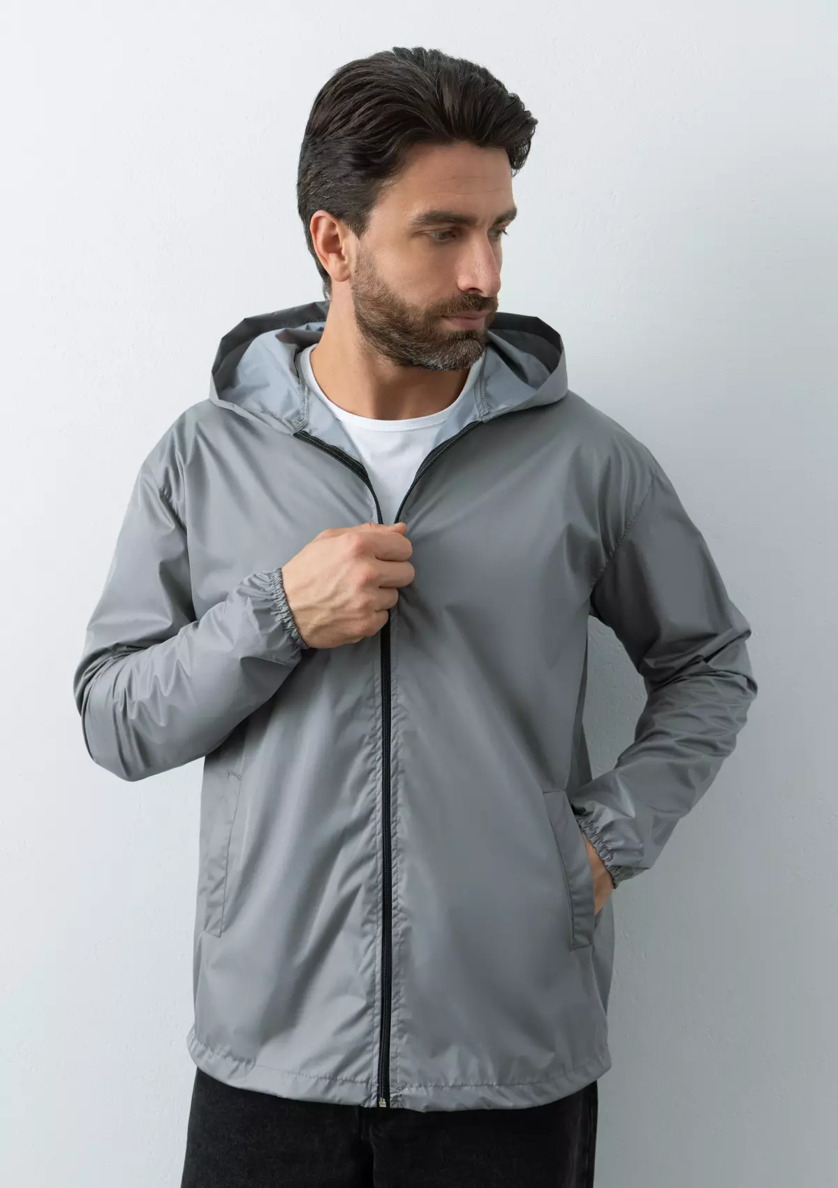 Ветровка прямого силуэта с глубоким капюшоном, спущенной линией плеча, прорезным карманом и застежкой на молнию. Для дополнительной защиты от ветра изделие дополнено эластичной резинкой на рукаве и кулисой по линии низа.